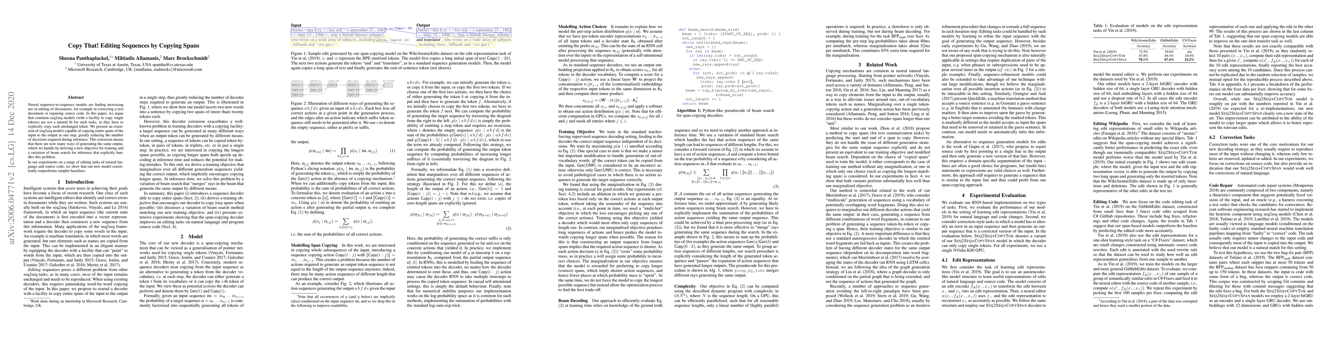 Neural sequence-to-sequence models are finding increasing use in editing of documents, for example in correcting a text document or repairing source code. In this paper, we argue that common seq2seq models (with a facility to copy single tokens) are not a natural fit for such tasks, as they have to explicitly copy each unchanged token. We present an extension of seq2seq models capable of copying entire spans of the input to the output in one step, greatly reducing the number of decisions required during inference. This extension means that there are now many ways of generating the same output, which we handle by deriving a new objective for training and a variation of beam search for inference that explicitly handles this problem. In our experiments on a range of editing tasks of natural language and source code, we show that our new model consistently outperforms simpler baselines.