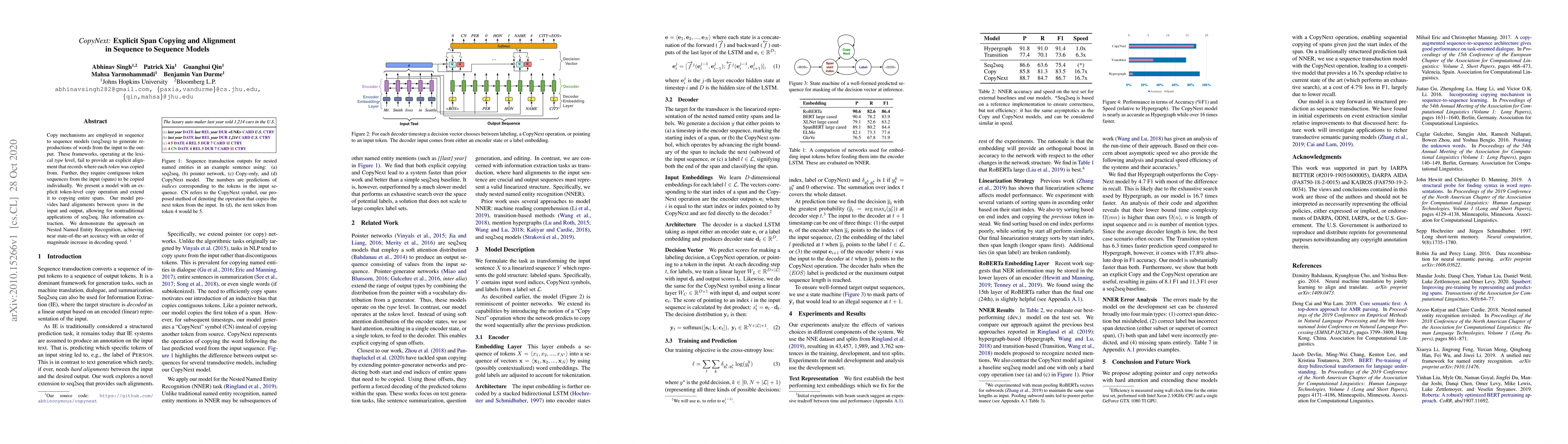 CopyNext introduces a sequence-to-sequence model with explicit span copying and alignment, enabling nontraditional seq2seq applications like information extraction. This model achieves near state-of-the-art accuracy in Nested Named Entity Recognition with significantly faster decoding speeds.