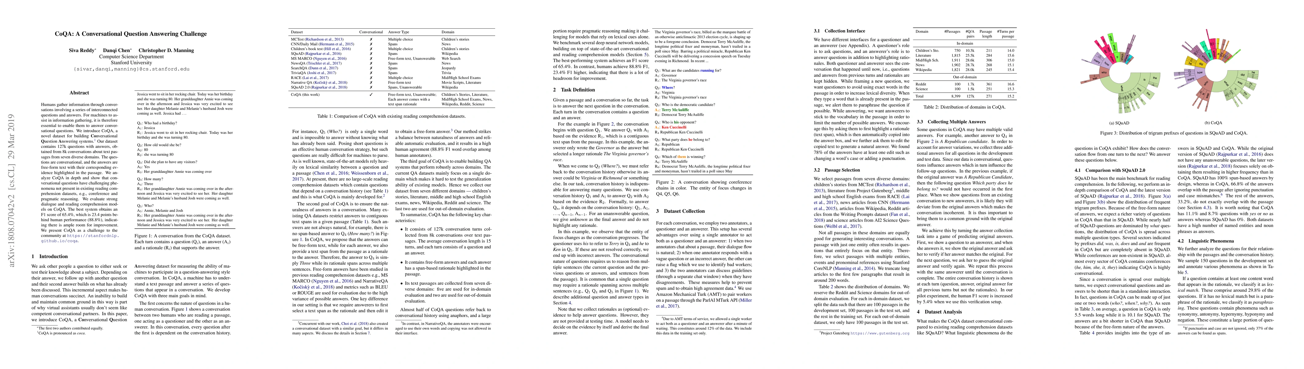 CoQA introduces a new dataset for developing Conversational Question Answering systems, featuring 127k questions from 8k conversations across diverse domains. The dataset highlights the challenges of conversational questions, such as coreference and pragmatic reasoning, and shows room for improvement in model performance.