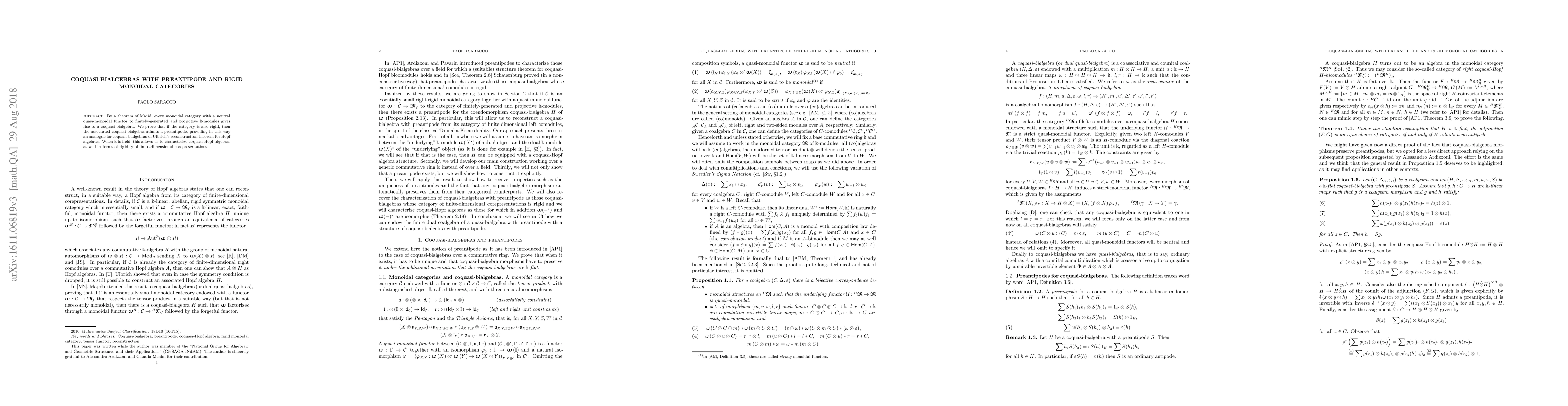 Majid's theorem links monoidal categories with coquasi-bialgebras. If the category is rigid, the coquasi-bialgebra acquires a preantipode, mirroring Ulbrich's Hopf algebra reconstruction theorem and allowing the characterization of coquasi-Hopf algebras based on the rigidity of finite-dimensional corepresentations.