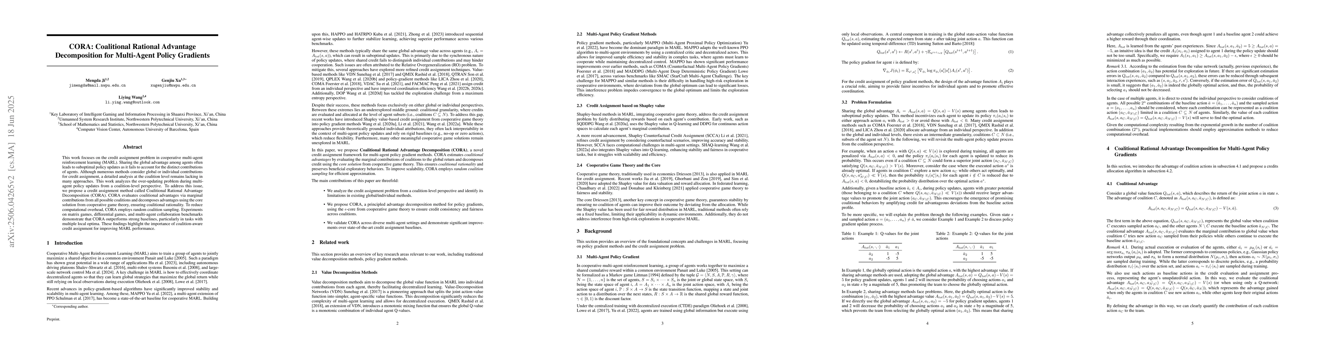 CORA, a novel credit assignment method that decomposes advantages using coalitional rationality from cooperative game theory, combined with random sampling for efficiency.