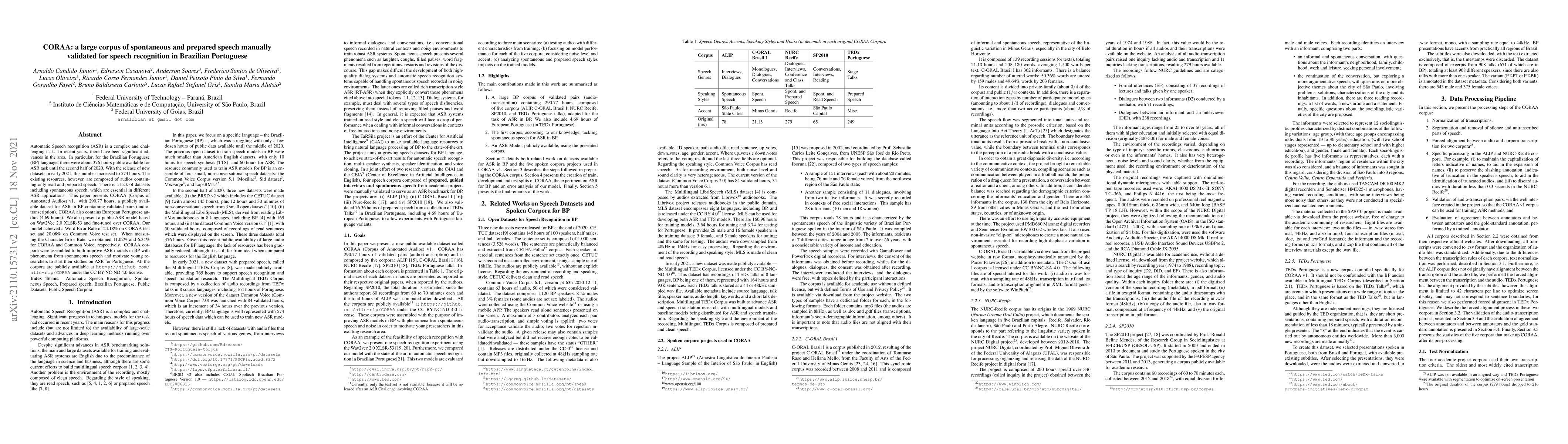 This paper introduces CORAA v1, a large dataset of 290.77 hours of Brazilian Portuguese spontaneous and prepared speech validated for ASR, addressing the lack of such resources. The authors also present an ASR model fine-tuned on CORAA achieving a Word Error Rate of 24.18% on its test set, aiming to improve ASR models and inspire further research in the field.