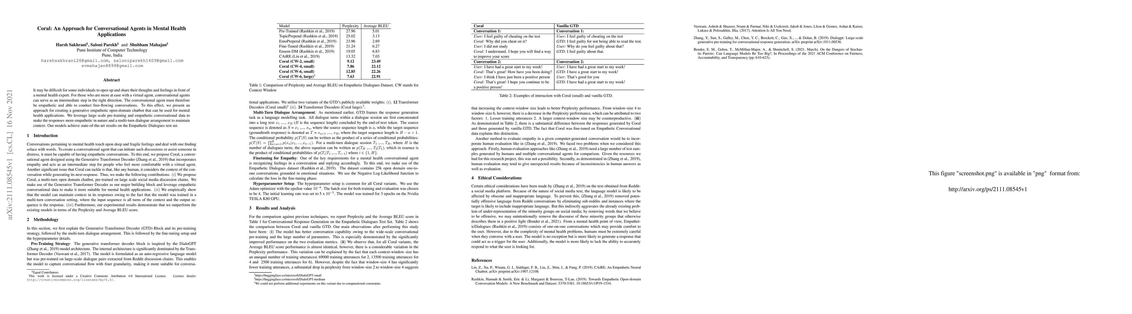 This paper presents Coral, a generative empathetic chatbot designed for mental health applications, leveraging large-scale pre-training and empathetic data to facilitate open-domain conversations. The model achieves state-of-the-art results on the Empathetic Dialogues test set, aiming to provide a comfortable conversational alternative for individuals seeking mental health support.
