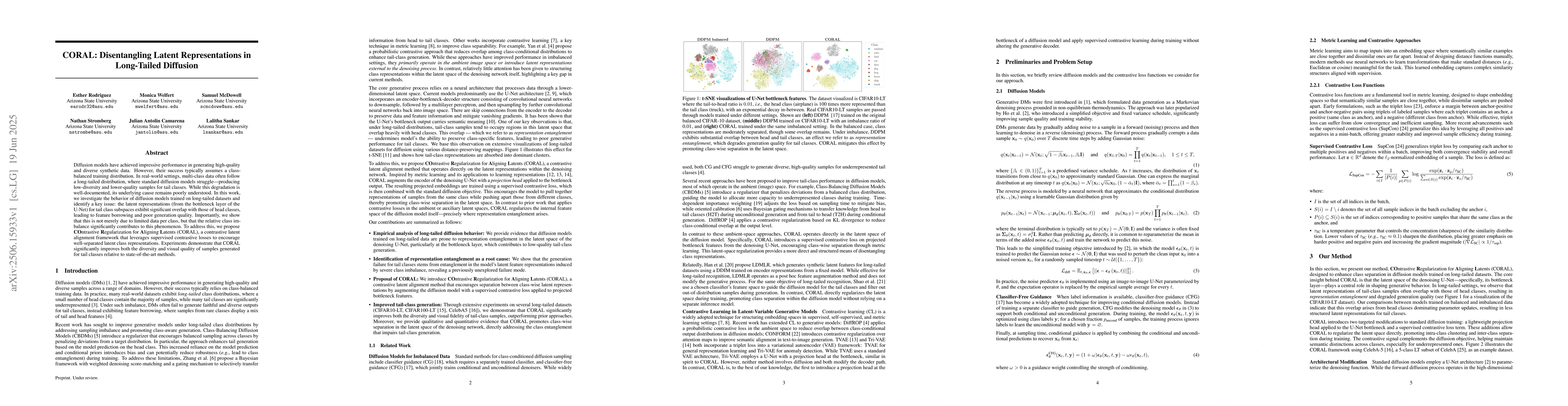 Diffusion models have achieved impressive performance in generating high-quality and diverse synthetic data. However, their success typically assumes a class-balanced training distribution. In real-world settings, multi-class data often follow a long-tailed distribution, where standard diffusion models struggle -- producing low-diversity and lower-quality samples for tail classes. While this degradation is well-documented, its underlying cause remains poorly understood. In this work, we investigate the behavior of diffusion models trained on long-tailed datasets and identify a key issue: the latent representations (from the bottleneck layer of the U-Net) for tail class subspaces exhibit significant overlap with those of head classes, leading to feature borrowing and poor generation quality. Importantly, we show that this is not merely due to limited data per class, but that the relative class imbalance significantly contributes to this phenomenon. To address this, we propose COntrastive Regularization for Aligning Latents (CORAL), a contrastive latent alignment framework that leverages supervised contrastive losses to encourage well-separated latent class representations. Experiments demonstrate that CORAL significantly improves both the diversity and visual quality of samples generated for tail classes relative to state-of-the-art methods.
