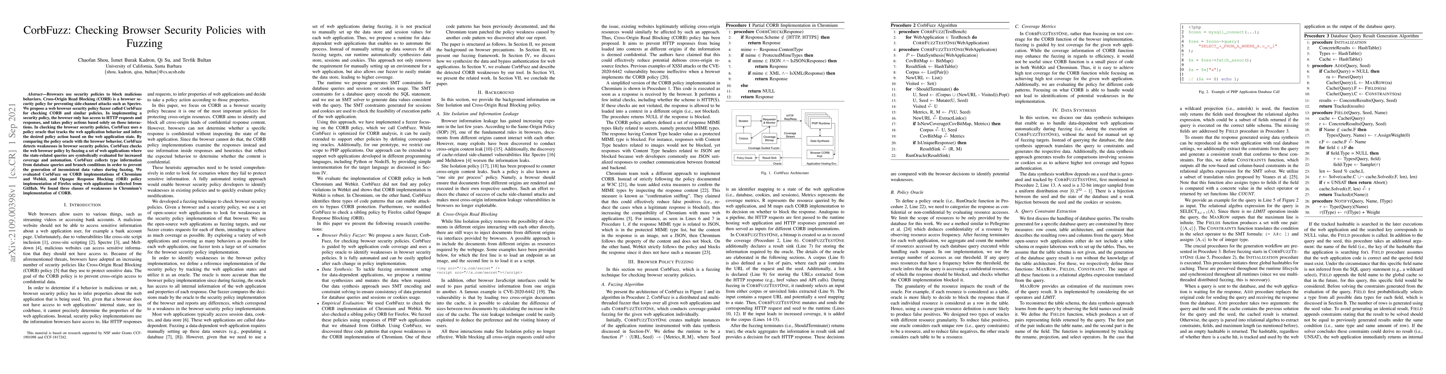 CorbFuzz is a coverage-guided fuzzer that checks browser security policies, specifically Cross-Origin Read Blocking (CORB) in Chromium and WebKit, and Opaque Response Blocking (ORB) in Firefox. It uses a policy oracle that tracks web application behavior to infer desired policy actions, comparing this with browser behavior to detect weaknesses. Fuzzing is guided by test coverage of web applications, symbolically evaluating database queries for increased coverage and automation.