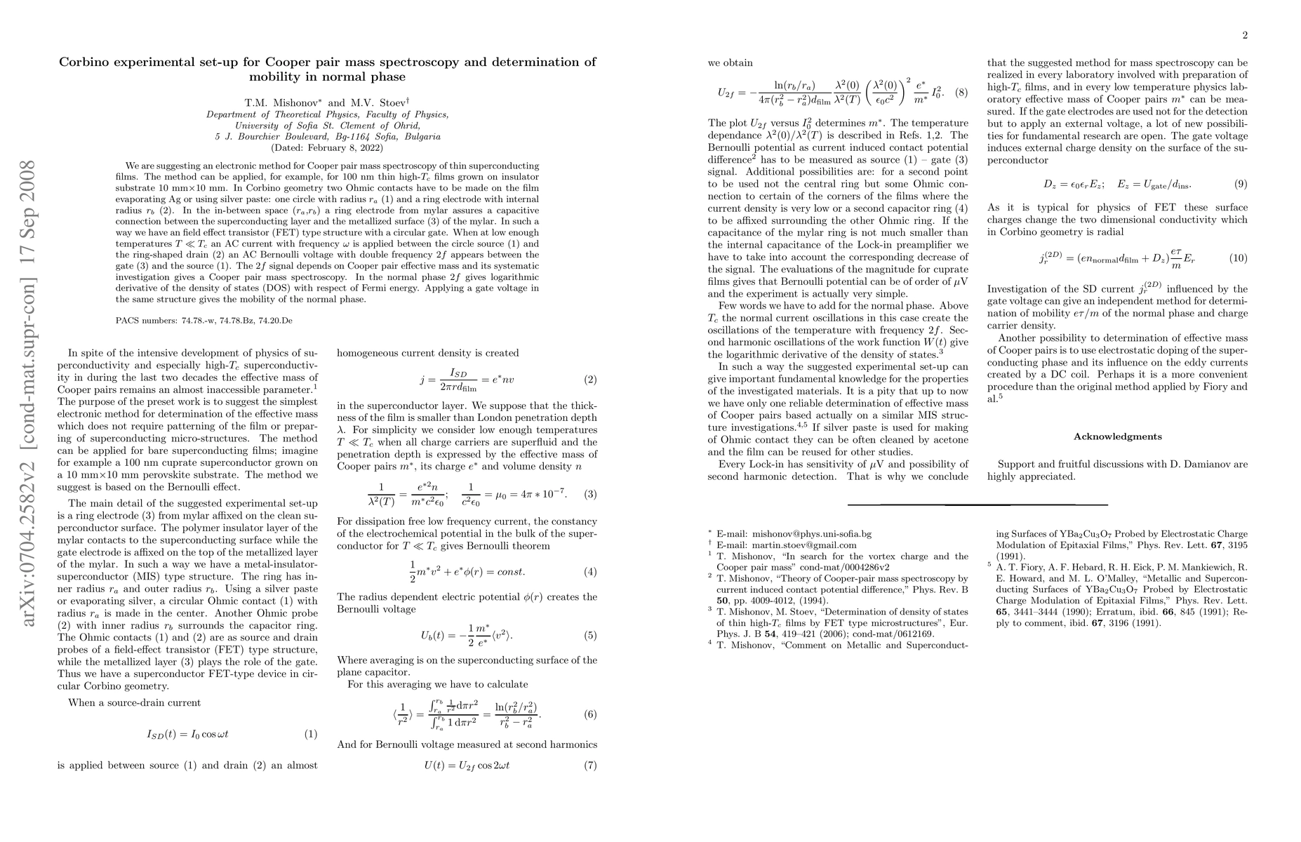 We are suggesting an electronic method for Cooper pair mass spectroscopy of thin superconducting films. The method can be applied, for example, for 100 nm thin high-T_c films grown on insulator substrate 10 mm X 10 mm. In Corbino geometry two Ohmic contacts have to be made on the film evaporating Ag or using silver paste: one circle with radius r_a (1) and a ring electrode with internal radius r_b (2). In the in-between space (r_a,r_b) a ring electrode from mylar assures a capacitive connection between the superconducting layer and the metallized surface (3) of the mylar. In such a way we have an field effect transistor (FET) type structure with a circular gate. When at low enough temperatures T << T_c an AC current with frequency omega is applied between the circle source (1) and the ring-shaped drain (2) an AC Bernoulli voltage with double frequency 2f appears between the gate (3) and the source (1). The 2f signal depends on Cooper pair effective mass and its systematic investigation gives a Cooper pair mass spectroscopy. In the normal phase 2f gives logarithmic derivative of the density of states (DOS) with respect of Fermi energy. Applying a gate voltage in the same structure gives the mobility of the normal phase.