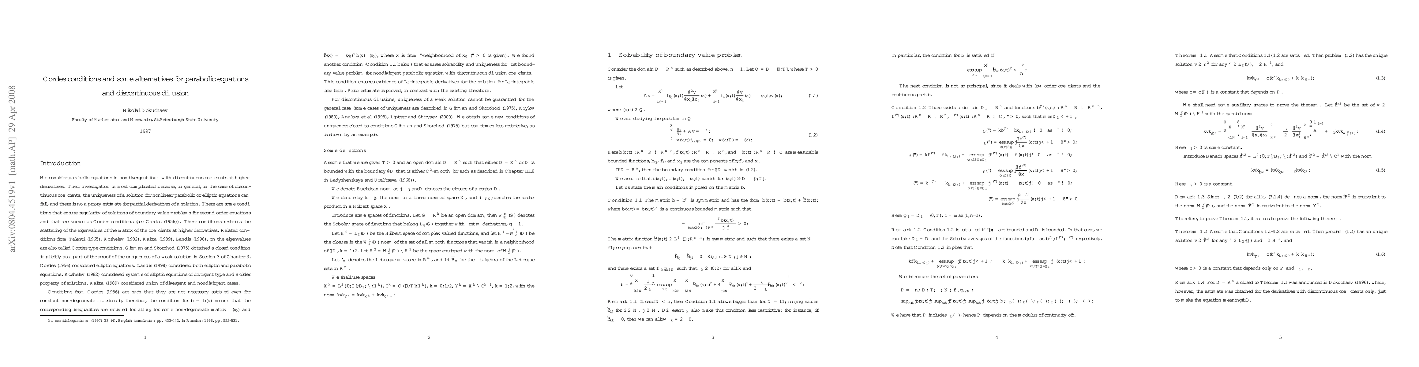 This paper explores parabolic equations with discontinuous coefficients at higher derivatives, addressing the challenges of solution uniqueness and lack of a priori estimates. It establishes existence and regularity results under Cordes-type restrictions and applies these findings to diffusion processes.