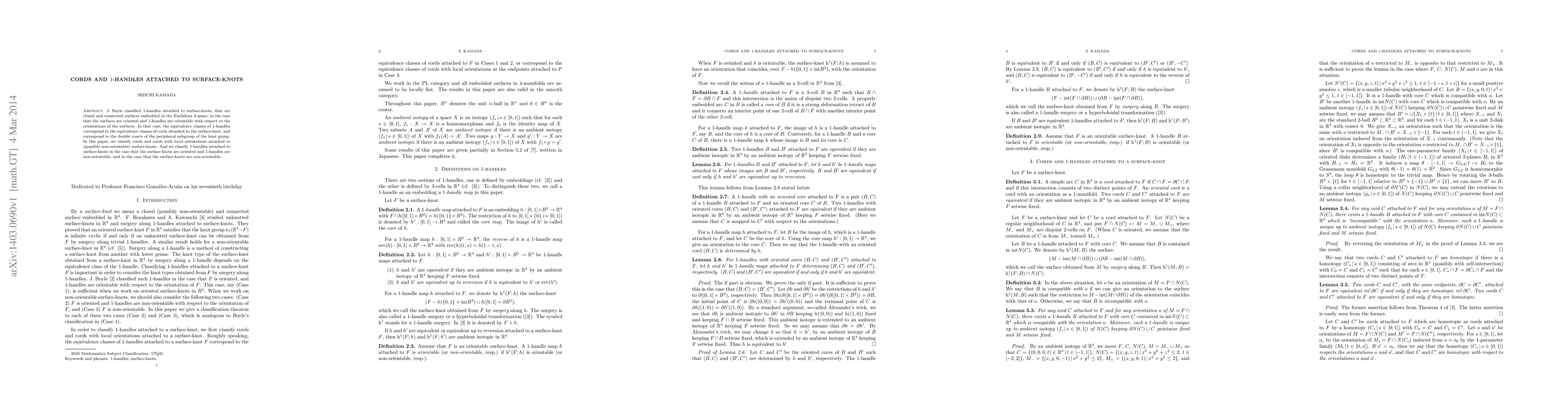 This paper classifies cords and 1-handles attached to surface-knots, extending J. Boyle's work to include non-orientable surface-knots and non-orientable 1-handles, establishing equivalence classes and connections to double cosets of the peripheral subgroup of the knot group.