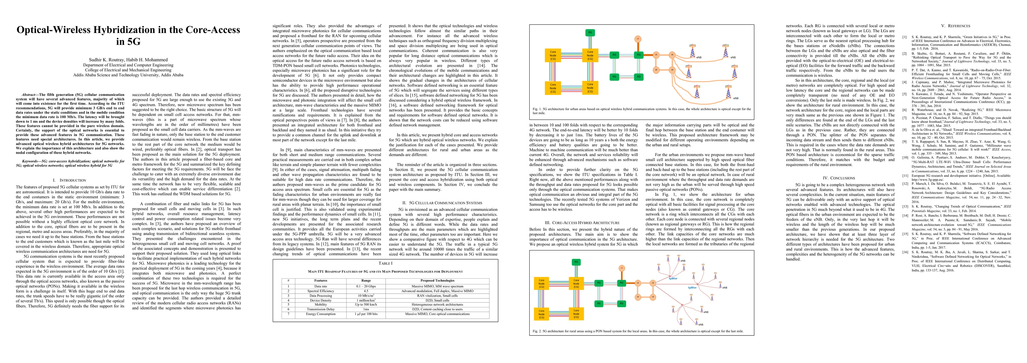 This paper proposes advanced optical wireless hybrid architectures for 5G networks to support high-speed data transfer and low latency. It aims to provide a solution to harness the benefits of both wireless and optical domains in 5G communication systems.