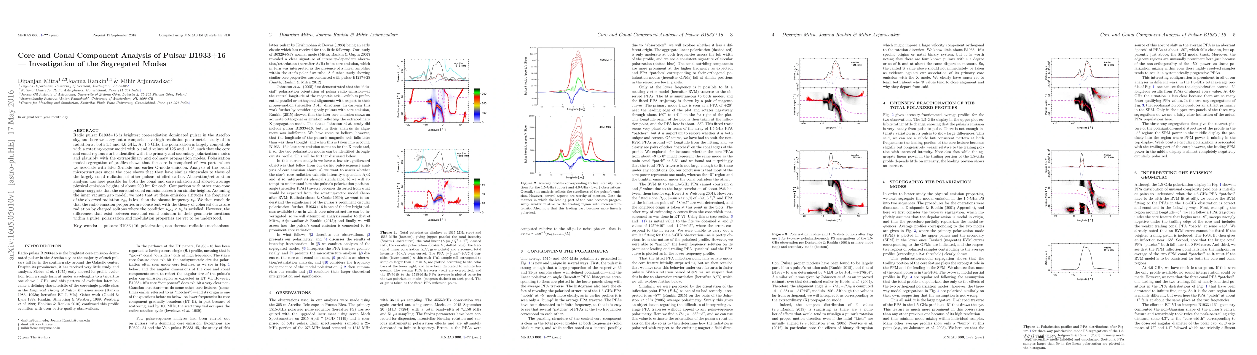 Radio pulsar B1933+16 is brightest core-radiation dominated pulsar in the Arecibo sky, and here we carry out a comprehensive high resolution polarimetric study of its radiation at both 1.5 and 4.6 GHz. At 1.5 GHz, the polarization is largely compatible with a rotating-vector model with $\alpha$ and $\beta$ values of 125 and --1.2$^{\circ}$, such that the core and conal regions can be identified with the primary and secondary polarization modes and plausibly with the extraordinary and ordinary propagation modes. Polarization modal segregation of profiles shows that the core is comprised of two parts which we associate with later X-mode and earlier O-mode emission. Analysis of the broad microstructures under the core shows that they have similar timescales to those of the largely conal radiation of other pulsars studied earlier. Aberration/retardation analysis was here possible for both the conal and core radiation and showed average physical emission heights of about 200 km for each. Comparison with other core-cone pulsars suggests that the core and conal emission arises from similar heights. Assuming the inner vacuum gap model, we note that at these emission altitudes the frequency of the observed radiation $\nu_{obs}$ is less than the plasma frequency $\nu_p$. We then conclude that the radio emission properties are consistent with the theory of coherent curvature radiation by charged solitons where the condition $\nu_{obs} < \nu_{p}$ is satisfied. However, the differences that exist between core and conal emission in their geometric locations within a pulse, polarization and modulation properties are yet to be understood.