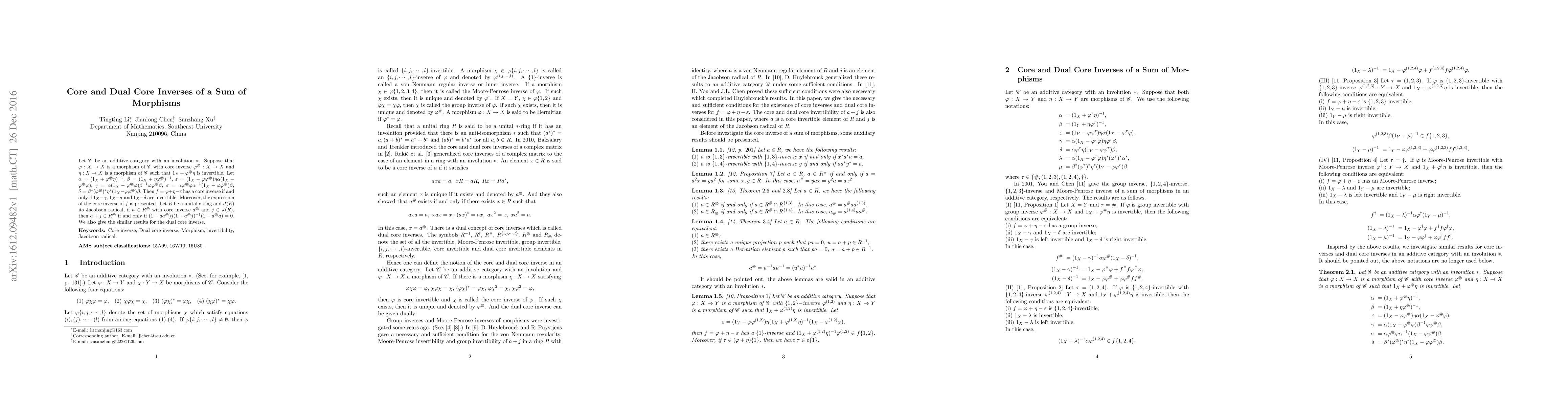 This paper investigates the conditions under which a sum of morphisms in an additive category with involution possesses a core inverse, focusing on expressions involving core and dual core inverses. It establishes criteria for the invertibility of certain operators and provides an explicit formula for the core inverse of the sum.