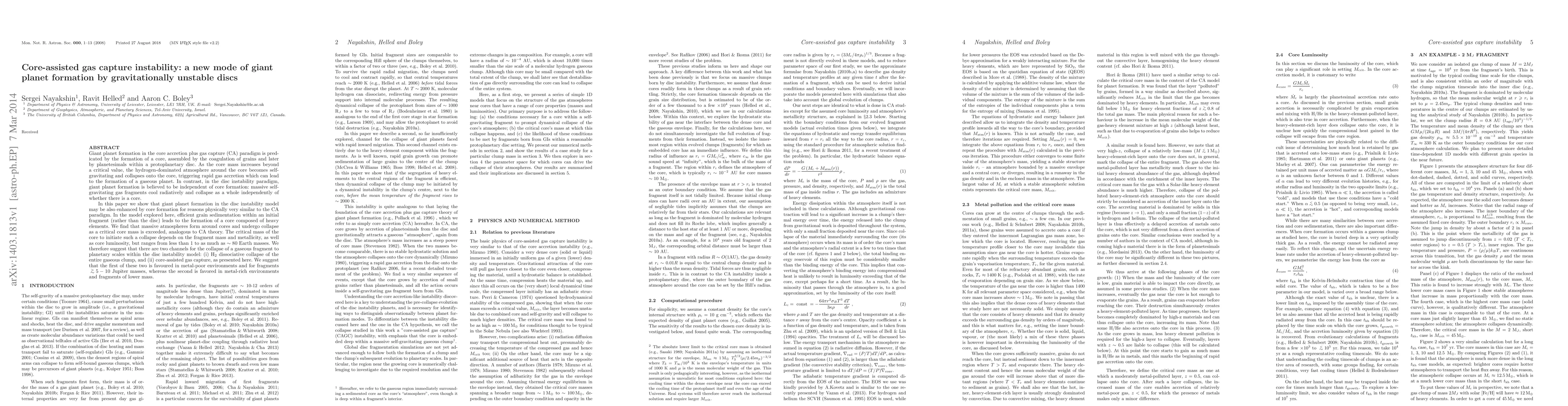 This paper proposes a new mode of giant planet formation within the disc instability paradigm, where core-assisted gas capture enhances planet formation through the formation of a core composed of heavy elements. It suggests two collapse channels: H$_2$ dissociative collapse and core-assisted gas capture, with the latter favored in metal-rich environments and smaller fragments.