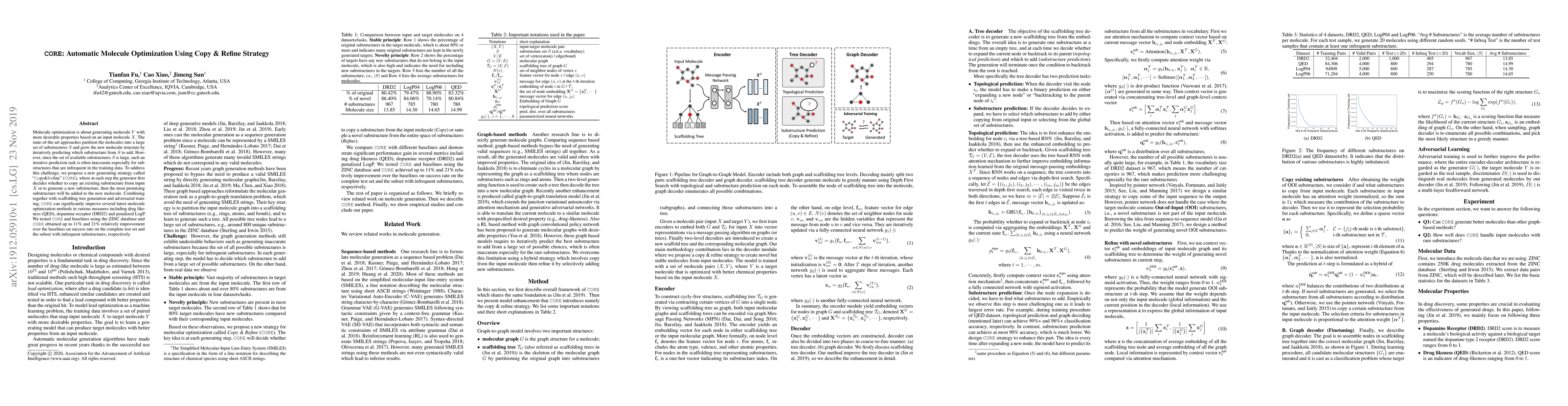 Molecule optimization is about generating molecule $Y$ with more desirable properties based on an input molecule $X$. The state-of-the-art approaches partition the molecules into a large set of substructures $S$ and grow the new molecule structure by iteratively predicting which substructure from $S$ to add. However, since the set of available substructures $S$ is large, such an iterative prediction task is often inaccurate especially for substructures that are infrequent in the training data. To address this challenge, we propose a new generating strategy called "Copy & Refine" (CORE), where at each step the generator first decides whether to copy an existing substructure from input $X$ or to generate a new substructure, then the most promising substructure will be added to the new molecule. Combining together with scaffolding tree generation and adversarial training, CORE can significantly improve several latest molecule optimization methods in various measures including drug likeness (QED), dopamine receptor (DRD2) and penalized LogP. We tested CORE and baselines using the ZINC database and CORE obtained up to 11% and 21% relatively improvement over the baselines on success rate on the complete test set and the subset with infrequent substructures, respectively.