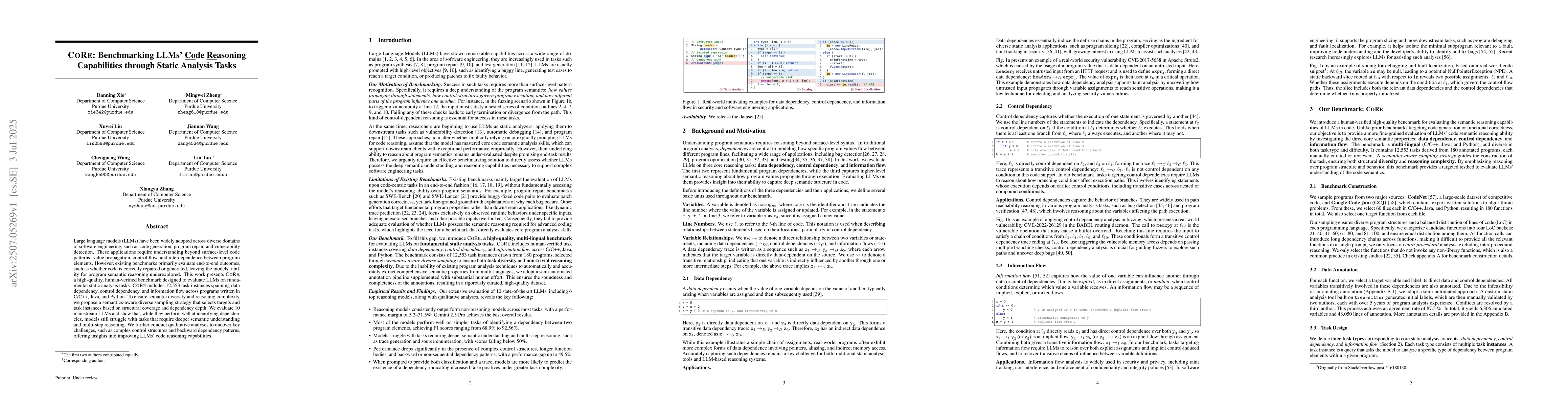 Large language models (LLMs) have been widely adopted across diverse software engineering domains, such as code generation, program repair, and vulnerability detection. These applications require understanding beyond surface-level code patterns: value propagation, control flow, and interdependence between program elements. However, existing benchmarks primarily evaluate end-to-end outcomes, such as whether code is correctly repaired or generated, leaving the models ability for program semantic reasoning underexplored. This work presents CoRe, a high-quality, human-verified benchmark designed to evaluate LLMs on fundamental static analysis tasks. CoRe includes 12,553 task instances spanning data dependency, control dependency, and information flow across programs written in C/C++, Java, and Python. To ensure semantic diversity and reasoning complexity, we propose a semantics-aware diverse sampling strategy that selects targets and task instances based on structural coverage and dependency depth. We evaluate 10 mainstream LLMs and show that, while they perform well at identifying dependencies, models still struggle with tasks that require deeper semantic understanding and multi-step reasoning. We further conduct qualitative analyses to uncover key challenges, such as complex control structures and backward dependency patterns, offering insights into improving LLMs code reasoning capabilities.