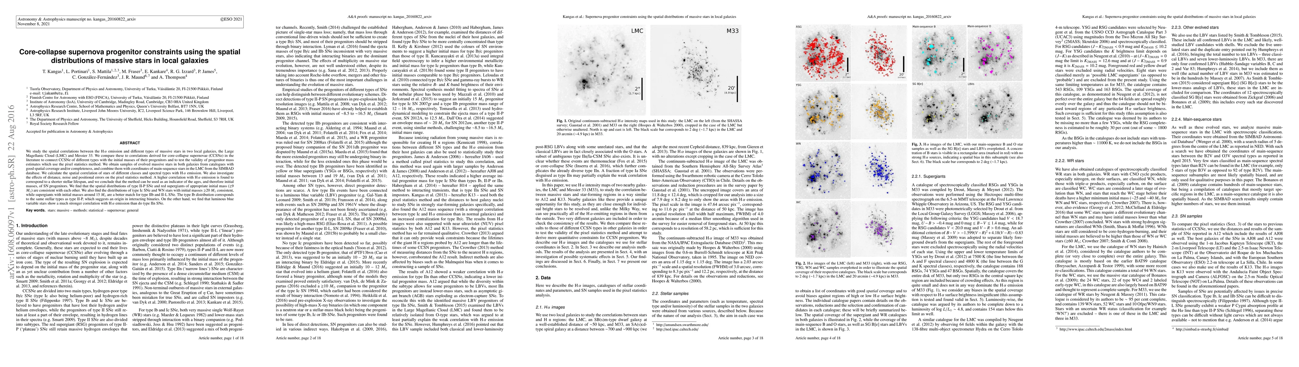 We study the spatial correlations between the H$\alpha$ emission and different types of massive stars in two local galaxies, the Large Magellanic Cloud (LMC) and Messier 33. We compare these to correlations derived for core-collapse supernovae (CCSNe) in the literature to connect CCSNe of different types with the initial masses of their progenitors and to test the validity of progenitor mass estimates which use the pixel statistics method. We obtain samples of evolved massive stars in both galaxies from catalogues with good spatial coverage and/or completeness, and combine them with coordinates of main-sequence stars in the LMC from the SIMBAD database. We calculate the spatial correlation of stars of different classes and spectral types with H$\alpha$ emission. We also investigate the effects of distance, noise and positional errors on the pixel statistics method. A higher correlation with H$\alpha$ emission is found to correspond to a shorter stellar lifespan, and we conclude that the method can be used as an indicator of the ages, and therefore initial masses, of SN progenitors. We find that the spatial distributions of type II-P SNe and red supergiants of appropriate initial mass ($\gtrsim$9 $M_{\odot}$) are consistent with each other. We also find the distributions of type Ic SNe and WN stars with initial masses $\gtrsim$20 $M_{\odot}$ consistent, while supergiants with initial masses around 15 $M_{\odot}$ are a better match for type IIb and II-L SNe. The type Ib distribution corresponds to the same stellar types as type II-P, which suggests an origin in interacting binaries. On the other hand, we find that luminous blue variable stars show a much stronger correlation with H$\alpha$ emission than do type IIn SNe.