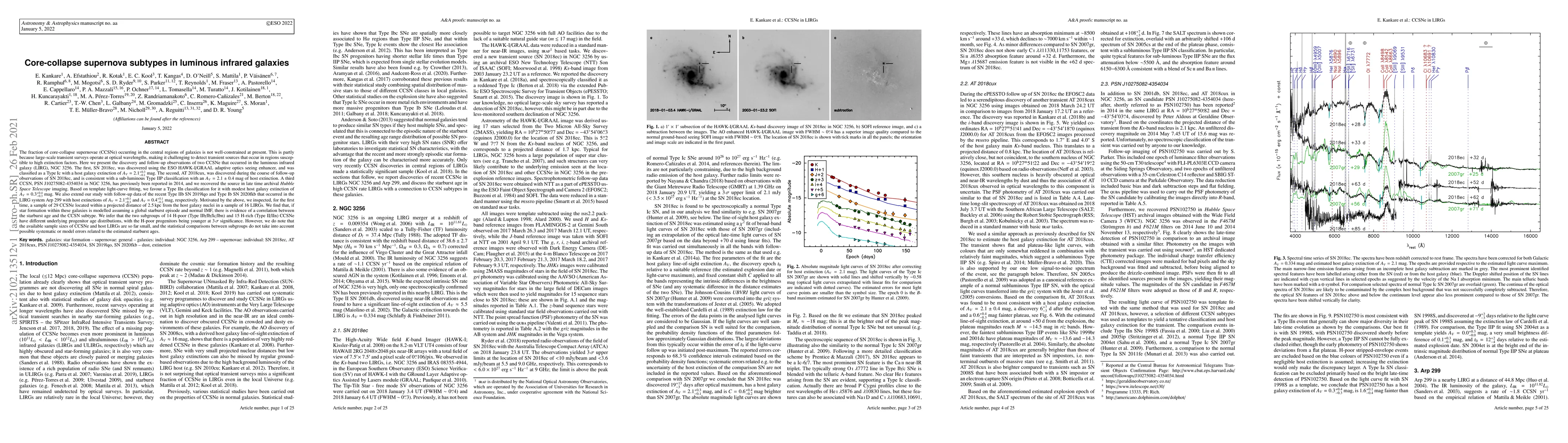 We present the discovery and follow-up observations of two CCSNe that occurred in the luminous infrared galaxy (LIRG), NGC3256. The first, SN2018ec, was discovered using the ESO HAWK-I/GRAAL adaptive optics seeing enhancer, and was classified as a Type Ic with a host galaxy extinction of $A_V=2.1^{+0.3}_{-0.1}$ mag. The second, AT2018cux, was discovered during the course of follow-up observations of SN2018ec, and is consistent with a sub-luminous Type IIP classification with an $A_V=2.1 \pm 0.4$ mag of host extinction. A third CCSN, PSNJ10275082-4354034 in NGC3256, has previously been reported in 2014, and we recovered the source in late time archival HST imaging. Based on template light-curve fitting, we favour a Type IIn classification for it with modest host galaxy extinction of $A_V=0.3^{+0.4}_{-0.3}$ mag. We also extend our study with follow-up data of the recent Type IIb SN2019lqo and Type Ib SN2020fkb that occurred in the LIRG system Arp299 with host extinctions of $A_V=2.1^{+0.1}_{-0.3}$ and $A_V=0.4^{+0.1}_{-0.2}$ mag, respectively. Motivated by the above, we inspected, for the first time, a sample of 29 CCSNe located within a projected distance of 2.5 kpc from the host galaxy nuclei in a sample of 16 LIRGs. We find that, if star formation within these galaxies is modelled assuming a global starburst episode and normal IMF, there is evidence of a correlation between the starburst age and the CCSN subtype. We infer that the two subgroups of 14 H-poor (Type IIb/Ib/Ic/Ibn) and 15 H-rich (Type II/IIn) CCSNe have different underlying progenitor age distributions, with the H-poor progenitors being younger at 3$\sigma$ significance. However, we do note that the available sample sizes of CCSNe and host LIRGs are so far small, and the statistical comparisons between subgroups do not take into account possible systematic or model errors related to the estimated starburst ages. (abridged)