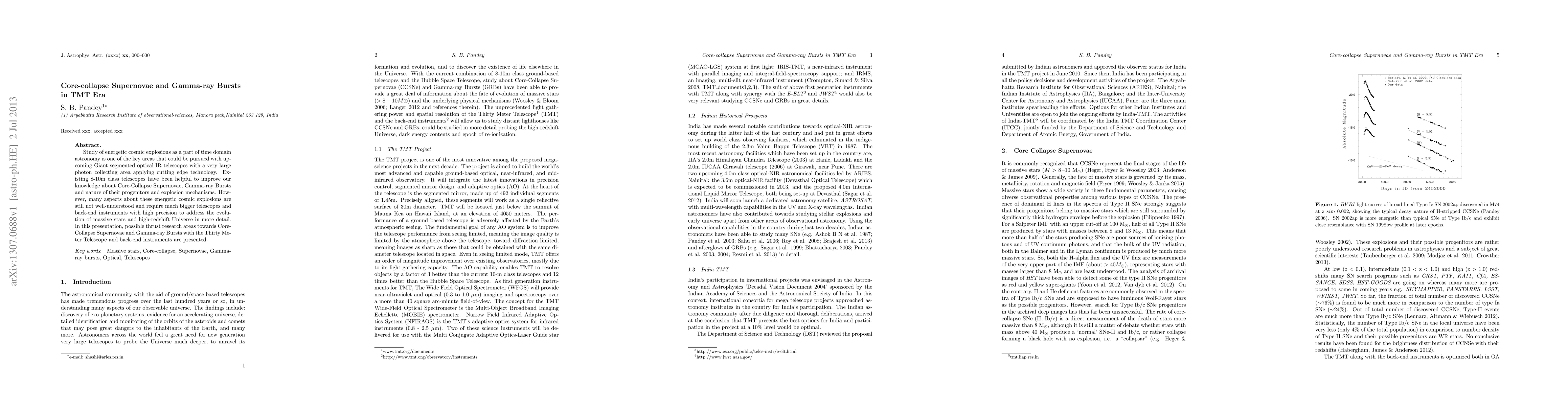 Study of energetic cosmic explosions as a part of time domain astronomy is one of the key areas that could be pursued with upcoming Giant segmented optical-IR telescopes with a very large photon collecting area applying cutting edge technology. Existing 8-10m class telescopes have been helpful to improve our knowledge about Core-Collapse Supernovae, Gamma-ray Bursts and nature of their progenitors and explosion mechanisms. However, many aspects about these energetic cosmic explosions are still not well-understood and require much bigger telescopes and back-end instruments with high precision to address the evolution of massive stars and high-redshift Universe in more detail. In this presentation, possible thrust research areas towards Core-Collapse Supernovae and Gamma-ray Bursts with the Thirty Meter Telescope and back-end instruments are presented.