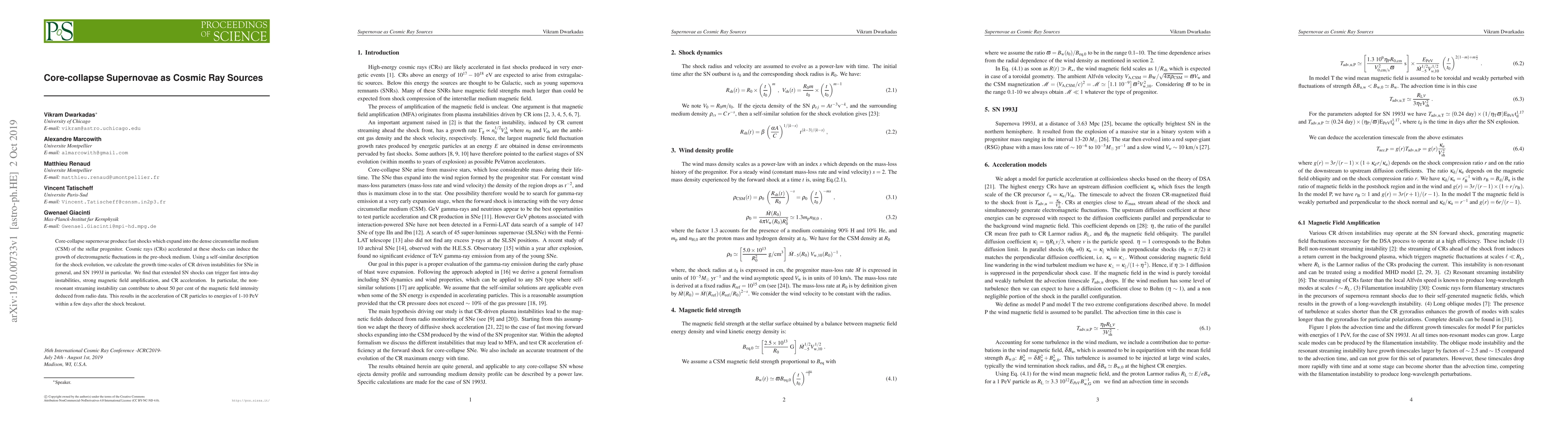 Core-collapse supernovae can accelerate cosmic rays to 1-10 PeV within days after shock breakout, triggering fast magnetic field amplification and strong instabilities. This process could be responsible for about half of the observed magnetic field intensity in some SN events.