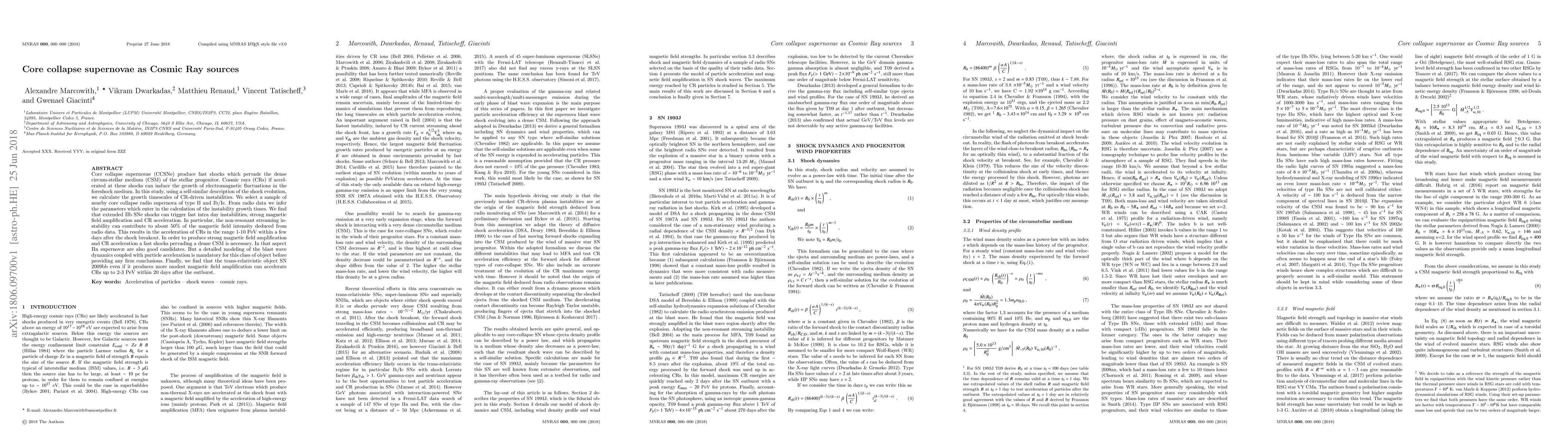 Core collapse supernovae can accelerate cosmic rays up to 2-3 PeV within days of the outburst, with extended IIb SNe potentially producing the most powerful magnetic field amplification.