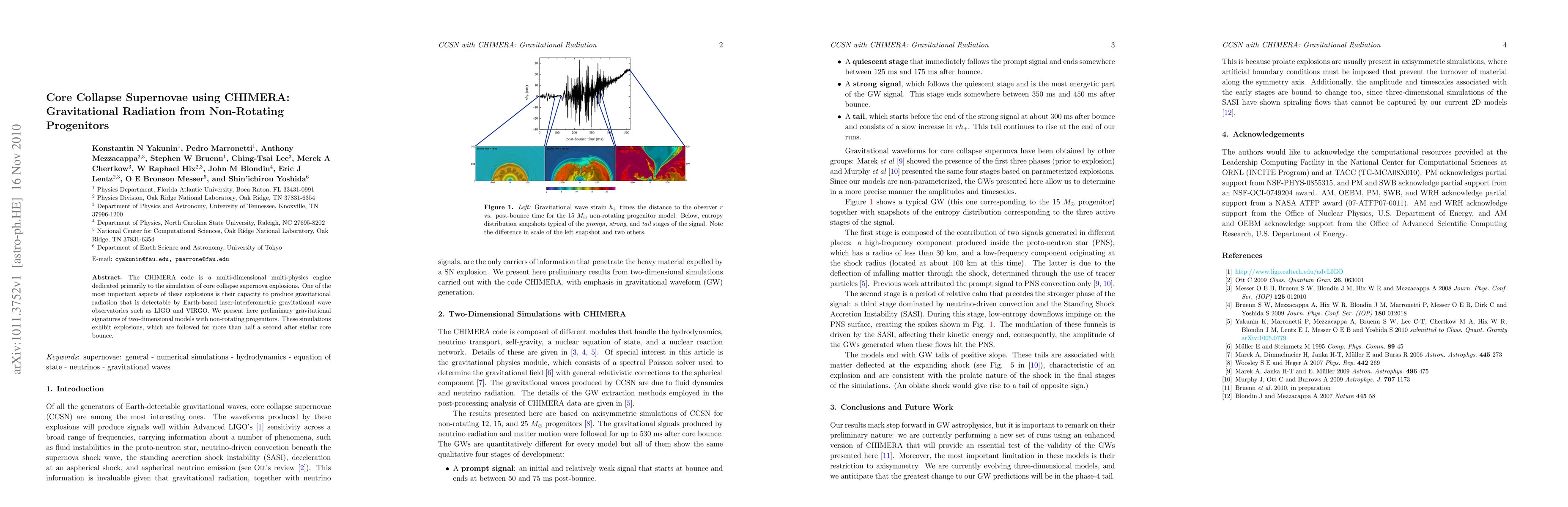 The CHIMERA code simulates core collapse supernovae, focusing on gravitational radiation from non-rotating progenitors. Preliminary results show detectable gravitational wave signatures from these explosions, which are followed for over half a second post-core bounce.