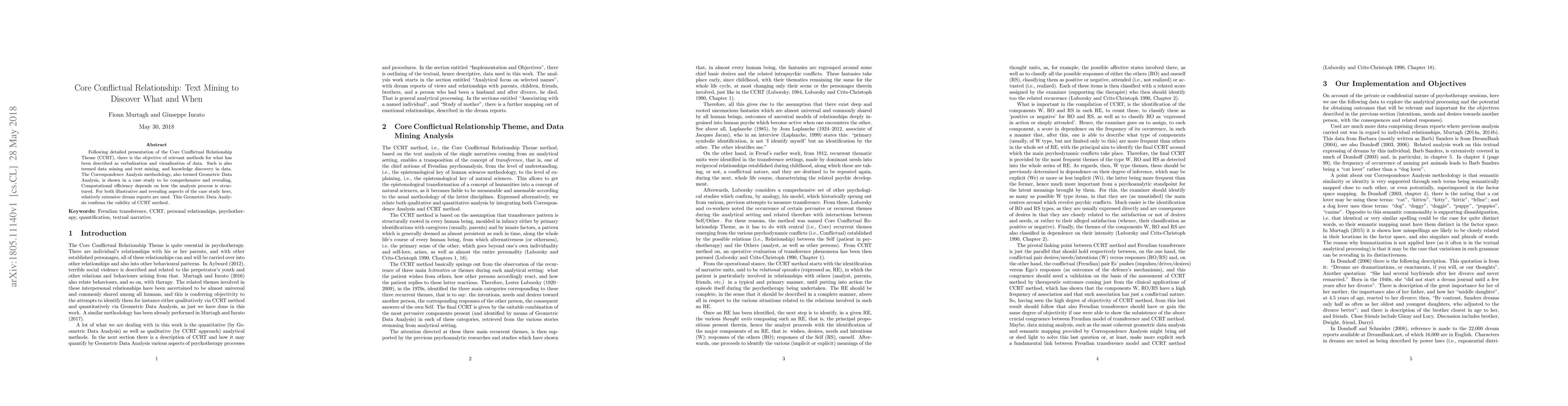Following detailed presentation of the Core Conflictual Relationship Theme (CCRT), there is the objective of relevant methods for what has been described as verbalization and visualization of data. Such is also termed data mining and text mining, and knowledge discovery in data. The Correspondence Analysis methodology, also termed Geometric Data Analysis, is shown in a case study to be comprehensive and revealing. Computational efficiency depends on how the analysis process is structured. For both illustrative and revealing aspects of the case study here, relatively extensive dream reports are used. This Geometric Data Analysis confirms the validity of CCRT method.