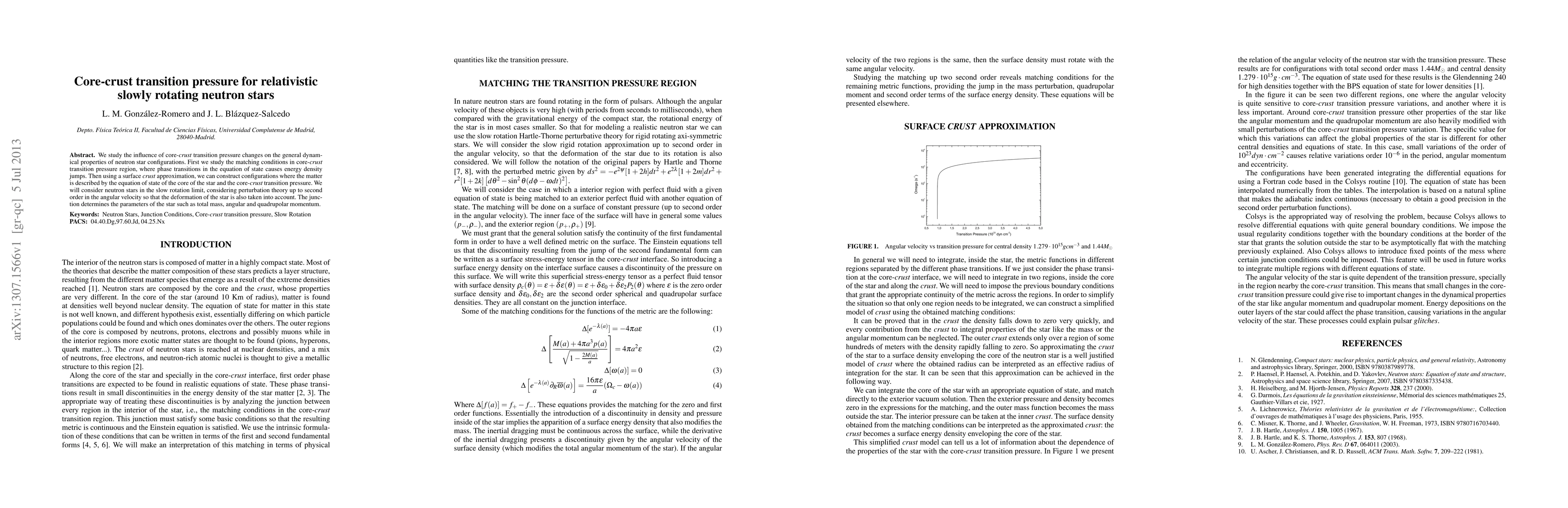 We study the influence of core-\textit{crust} transition pressure changes on the general dynamical properties of neutron star configurations. First we study the matching conditions in core-\textit{crust} transition pressure region, where phase transitions in the equation of state causes energy density jumps. Then using a surface \textit{crust} approximation, we can construct configurations where the matter is described by the equation of state of the core of the star and the core-\textit{crust} transition pressure. We will consider neutron stars in the slow rotation limit, considering perturbation theory up to second order in the angular velocity so that the deformation of the star is also taken into account. The junction determines the parameters of the star such as total mass, angular and quadrupolar momentum.