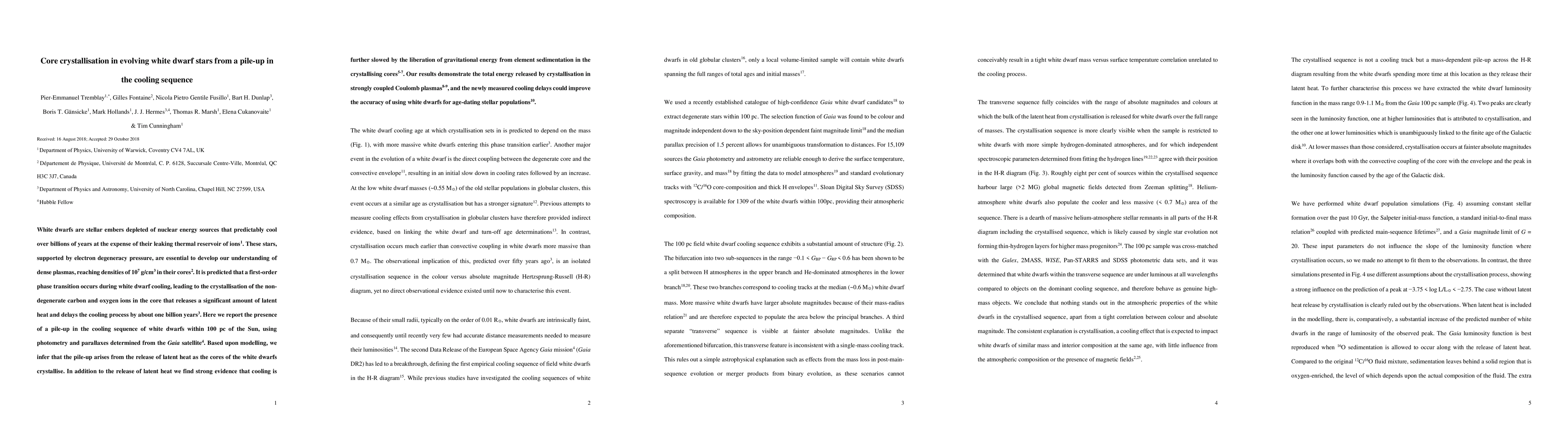 This paper reports observational evidence of a pile-up in the cooling sequence of white dwarfs, suggesting crystallization of carbon and oxygen cores releases latent heat. The study also finds that gravitational energy from element sedimentation further slows cooling, improving methods for determining stellar population ages.