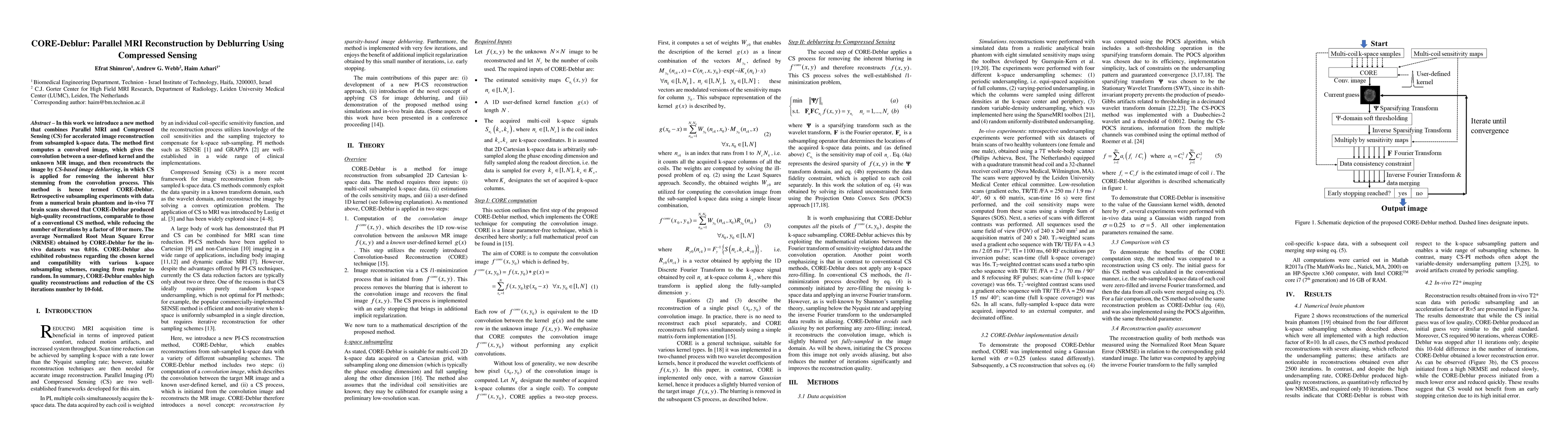 CORE-Deblur integrates Parallel MRI and Compressed Sensing for accelerated MRI reconstruction from subsampled k-space data, achieving high-quality results comparable to conventional methods while reducing iterations by a factor of 10. The method demonstrated robustness and compatibility with various subsampling schemes.