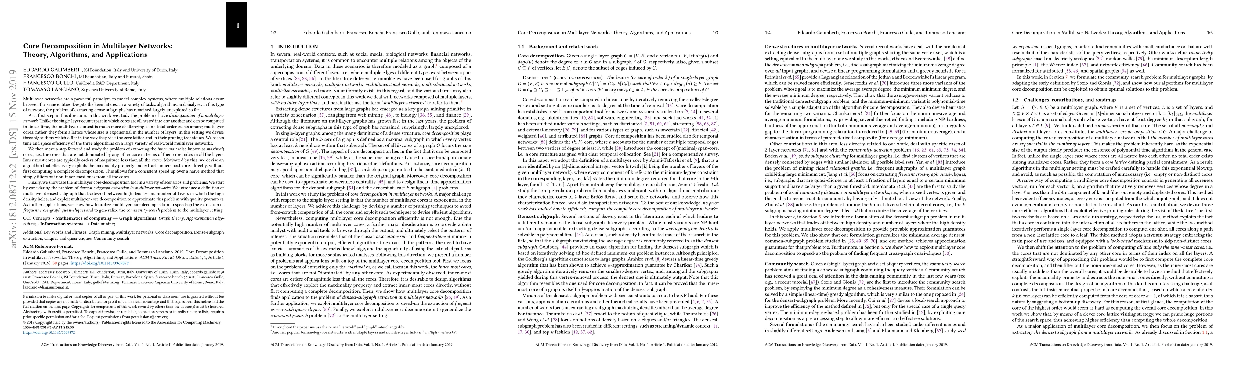 Multilayer networks are a powerful paradigm to model complex systems, where multiple relations occur between the same entities. Despite the keen interest in a variety of tasks, algorithms, and analyses in this type of network, the problem of extracting dense subgraphs has remained largely unexplored so far. In this work we study the problem of core decomposition of a multilayer network. The multilayer context is much challenging as no total order exists among multilayer cores; rather, they form a lattice whose size is exponential in the number of layers. In this setting we devise three algorithms which differ in the way they visit the core lattice and in their pruning techniques. We then move a step forward and study the problem of extracting the inner-most (also known as maximal) cores, i.e., the cores that are not dominated by any other core in terms of their core index in all the layers. Inner-most cores are typically orders of magnitude less than all the cores. Motivated by this, we devise an algorithm that effectively exploits the maximality property and extracts inner-most cores directly, without first computing a complete decomposition. Finally, we showcase the multilayer core-decomposition tool in a variety of scenarios and problems. We start by considering the problem of densest-subgraph extraction in multilayer networks. We introduce a definition of multilayer densest subgraph that trades-off between high density and number of layers in which the high density holds, and exploit multilayer core decomposition to approximate this problem with quality guarantees. As further applications, we show how to utilize multilayer core decomposition to speed-up the extraction of frequent cross-graph quasi-cliques and to generalize the community-search problem to the multilayer setting.