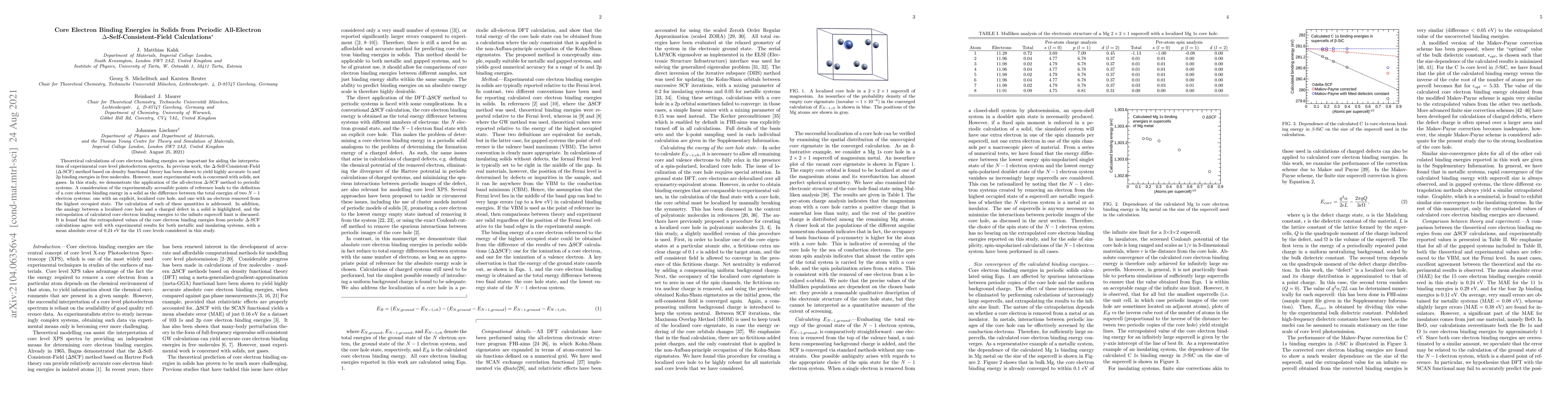 This paper applies the all-electron $\Delta$-Self-Consistent-Field method to calculate core electron binding energies in solids, finding good agreement with experimental data, with a mean absolute error of 0.24 eV for 15 core levels, and demonstrating the method's effectiveness for solid-state systems.