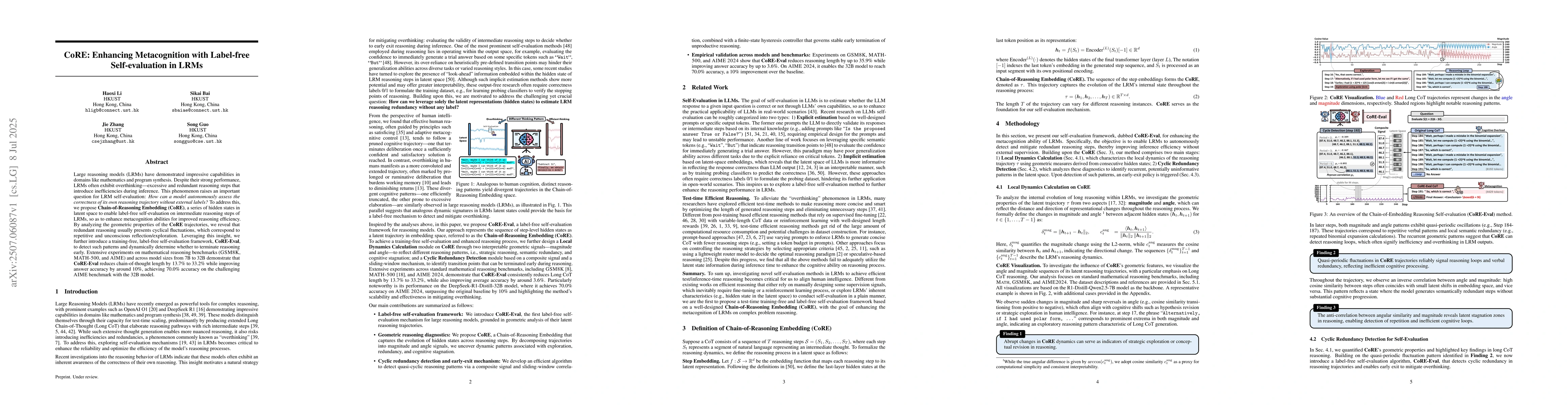 Large reasoning models (LRMs) have demonstrated impressive capabilities in domains like mathematics and program synthesis. Despite their strong performance, LRMs often exhibit overthinking -- excessive and redundant reasoning steps that introduce inefficiencies during inference. This phenomenon raises an important question for LRM self-evaluation: How can a model autonomously assess the correctness of its own reasoning trajectory without external labels? To address this, we propose Chain-of-Reasoning Embedding (CoRE), a series of hidden states in latent space to enable label-free self-evaluation on intermediate reasoning steps of LRMs, so as to enhance metacognition abilities for improved reasoning efficiency. By analyzing the geometric properties of the CoRE trajectories, we reveal that redundant reasoning usually presents cyclical fluctuations, which correspond to repetitive and unconscious reflection/exploration. Leveraging this insight, we further introduce a training-free, label-free self-evaluation framework, CoRE-Eval, to detect such patterns and dynamically determine whether to terminate reasoning early. Extensive experiments on mathematical reasoning benchmarks (GSM8K, MATH-500, and AIME) and across model sizes from 7B to 32B demonstrate that CoRE-Eval reduces chain-of-thought length by 13.7% to 33.2% while improving answer accuracy by around 10%, achieving 70.0% accuracy on the challenging AIME benchmark with the 32B model.
