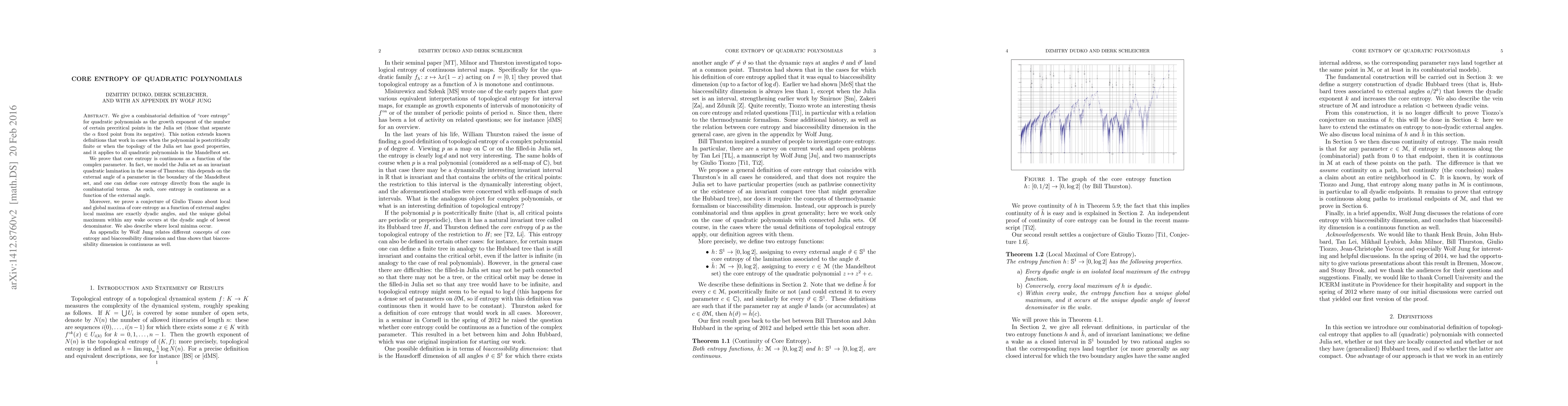 We give a combinatorial definition of "core entropy" for quadratic polynomials as the growth exponent of the number of certain precritical points in the Julia set (those that separate the $\alpha$ fixed point from its negative). This notion extends known definitions that work in cases when the polynomial is postcritically finite or when the topology of the Julia set has good properties, and it applies to all quadratic polynomials in the Mandelbrot set. We prove that core entropy is continuous as a function of the complex parameter. In fact, we model the Julia set as an invariant quadratic lamination in the sense of Thurston: this depends on the external angle of a parameter in the boundary of the Mandelbrot set, and one can define core entropy directly from the angle in combinatorial terms. As such, core entropy is continuous as a function of the external angle. Moreover, we prove a conjecture of Giulio Tiozzo about local and global maxima of core entropy as a function of external angles: local maxima are exactly dyadic angles, and the unique global maximum within any wake occurs at the dyadic angle of lowest denominator. We also describe where local minima occur. An appendix by Wolf Jung relates different concepts of core entropy and biaccessibility dimension and thus shows that biaccessibility dimension is continuous as well.