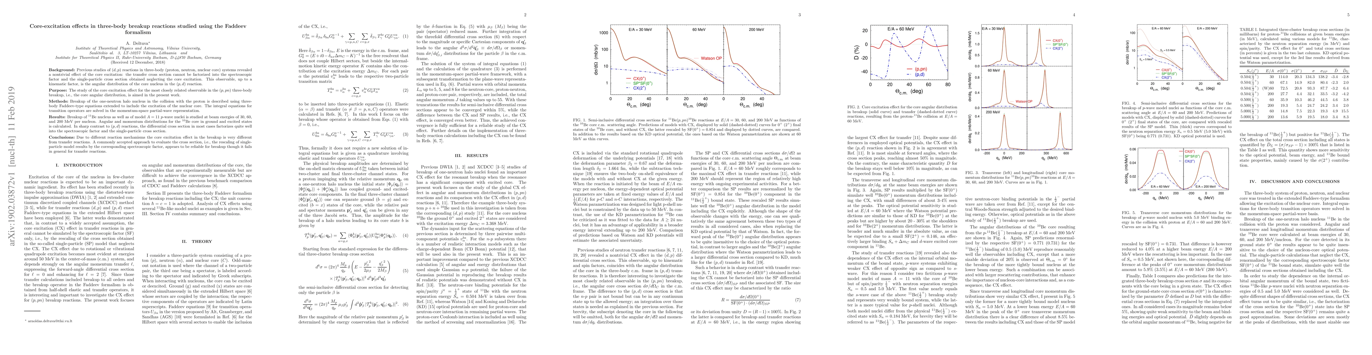 This paper investigates the core-excitation effects in three-body breakup reactions using the Faddeev formalism, finding that the differential cross section factorizes well in breakup reactions, unlike in transfer reactions, where core excitation significantly alters the cross section. The study focuses on the 11Be nucleus and model A=11 p-wave nuclei, showing that the commonly accepted approach for evaluating cross sections is reliable for breakup reactions.