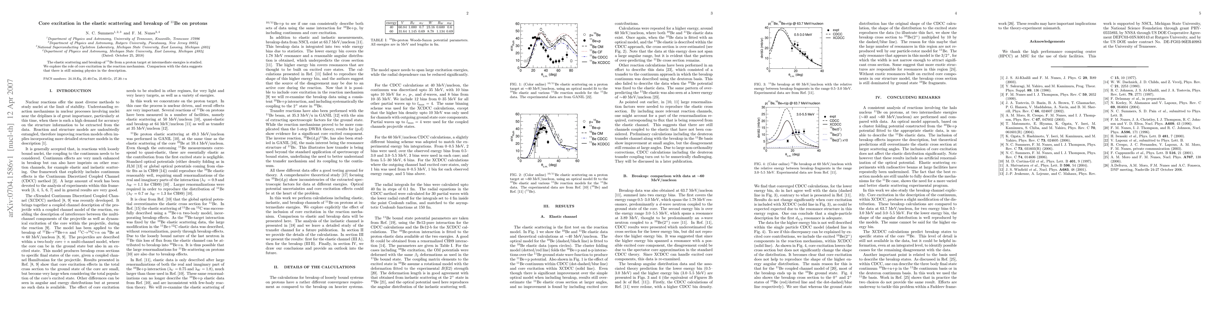 Researchers studied the scattering and breakup of $^{11}$Be on protons at intermediate energies to understand core excitation in reactions. They found missing physics in their description.