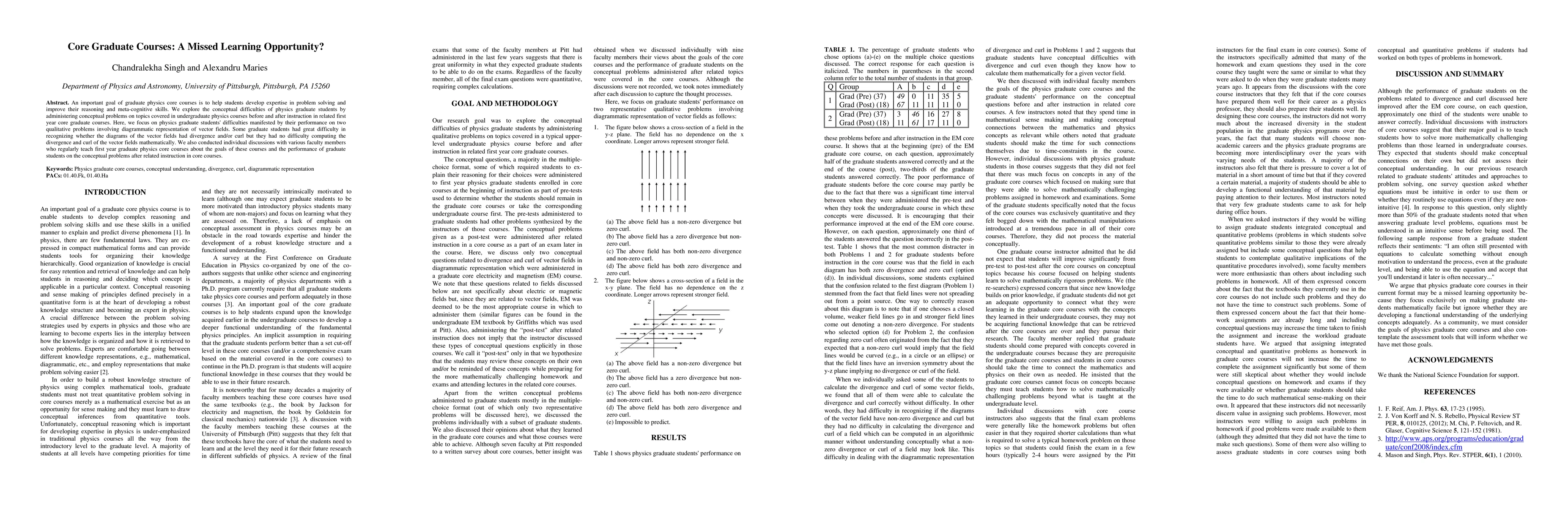 An important goal of graduate physics core courses is to help students develop expertise in problem solving and improve their reasoning and meta-cognitive skills. We explore the conceptual difficulties of physics graduate students by administering conceptual problems on topics covered in undergraduate physics courses before and after instruction in related first year core graduate courses. Here, we focus on physics graduate students' difficulties manifested by their performance on two qualitative problems involving diagrammatic representation of vector fields. Some graduate students had great difficulty in recognizing whether the diagrams of the vector fields had divergence and/or curl but they had no difficulty computing the divergence and curl of the vector fields mathematically. We also conducted individual discussions with various faculty members who regularly teach first year graduate physics core courses about the goals of these courses and the performance of graduate students on the conceptual problems after related instruction in core courses.