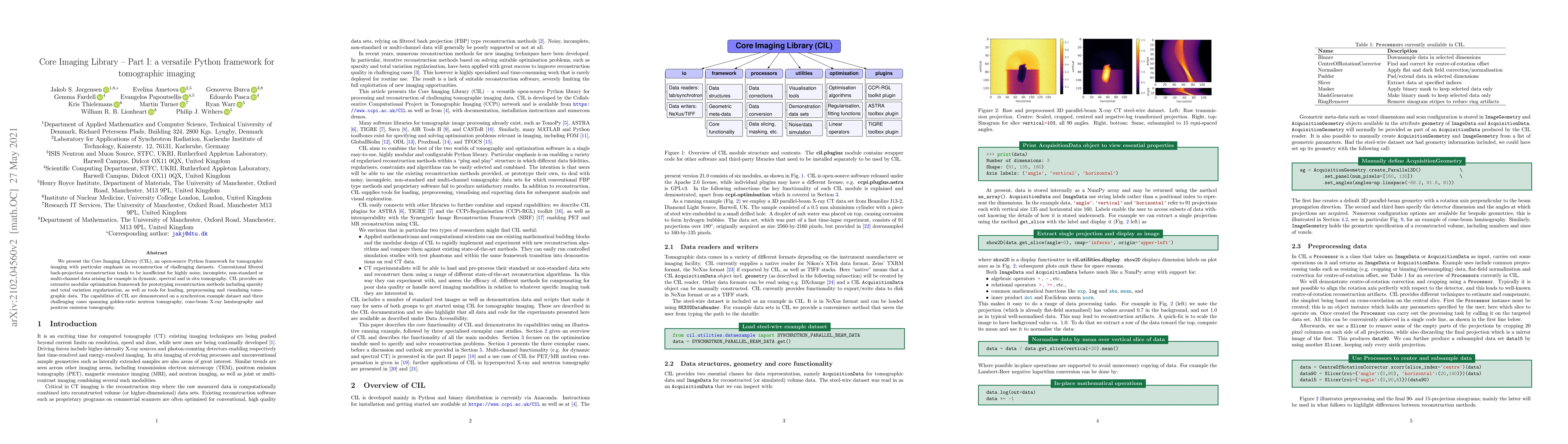 The Core Imaging Library (CIL) is an open-source Python framework designed to reconstruct challenging tomographic datasets, offering advanced tools for handling noisy, incomplete, or non-standard data. It includes modular optimization for prototyping reconstruction methods and supports data loading, preprocessing, and visualization.