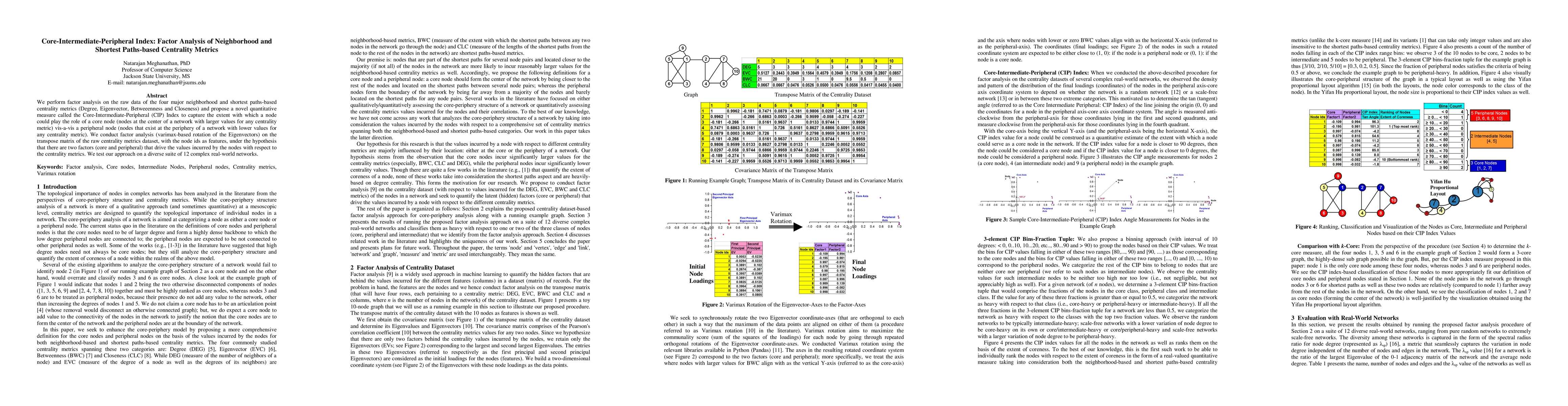 We perform factor analysis on the raw data of the four major neighborhood and shortest paths-based centrality metrics (Degree, Eigenvector, Betweeenness and Closeness) and propose a novel quantitative measure called the Core-Intermediate-Peripheral (CIP) Index to capture the extent with which a node could play the role of a core node (nodes at the center of a network with larger values for any centrality metric) vis-a-vis a peripheral node (nodes that exist at the periphery of a network with lower values for any centrality metric). We conduct factor analysis (varimax-based rotation of the Eigenvectors) on the transpose matrix of the raw centrality metrics dataset, with the node ids as features, under the hypothesis that there are two factors (core and peripheral) that drive the values incurred by the nodes with respect to the centrality metrics. We test our approach on a diverse suite of 12 complex real-world networks.