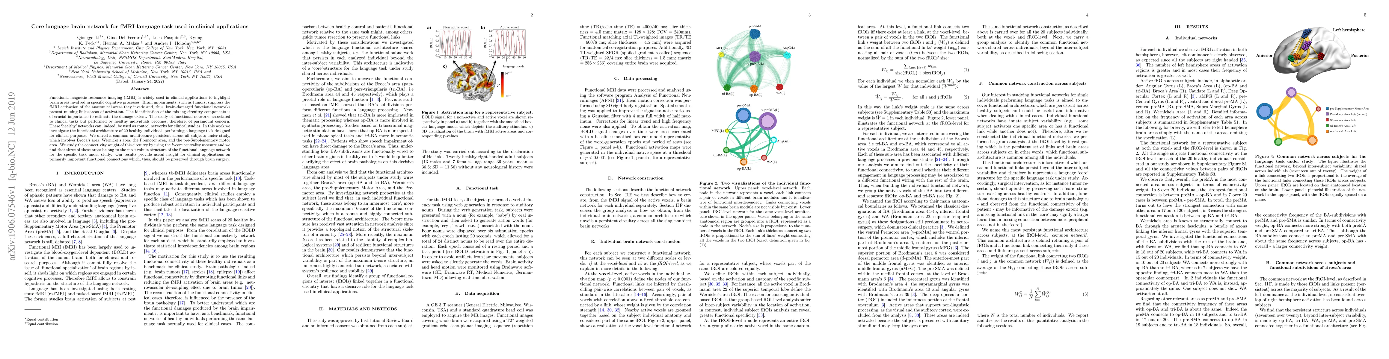 Functional magnetic resonance imaging (fMRI) is widely used in clinical applications to highlight brain areas involved in specific cognitive processes. Brain impairments, such as tumors, suppress the fMRI activation of the anatomical areas they invade and, thus, brain-damaged functional networks present missing links/areas of activation. The identification of the missing circuitry components is of crucial importance to estimate the damage extent. The study of functional networks associated to clinical tasks but performed by healthy individuals becomes, therefore, of paramount concern. These `healthy' networks can, indeed, be used as control networks for clinical studies. In this work we investigate the functional architecture of 20 healthy individuals performing a language task designed for clinical purposes. We unveil a common architecture persistent across all subjects under study, which involves Broca's area, Wernicke's area, the Premotor area, and the pre-Supplementary motor area. We study the connectivity weight of this circuitry by using the k-core centrality measure and we find that three of these areas belong to the most robust structure of the functional language network for the specific task under study. Our results provide useful insight for clinical applications on primarily important functional connections which, thus, should be preserved through brain surgery.