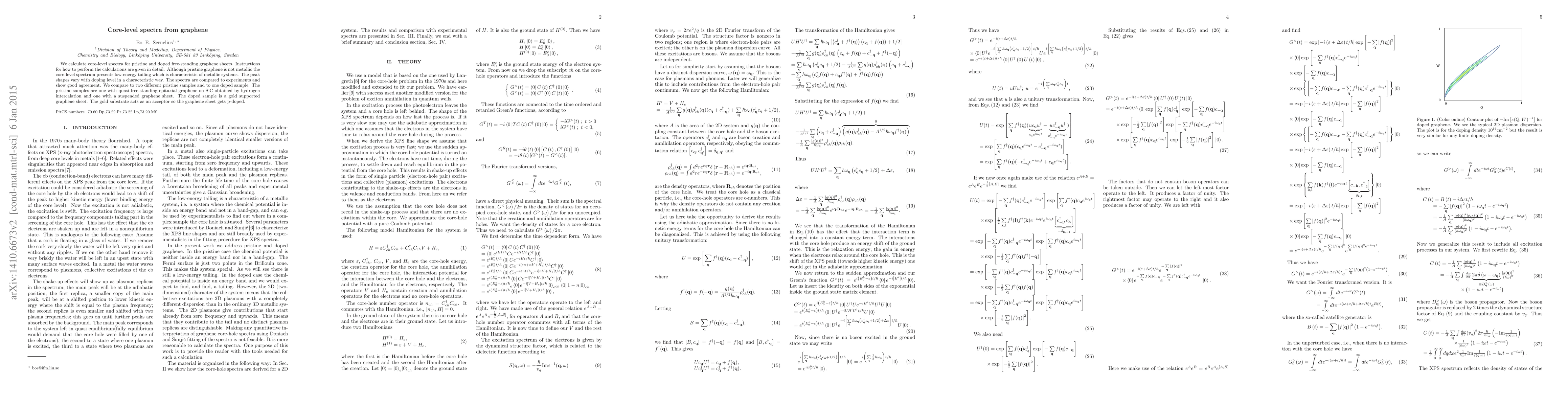 We calculate core-level spectra for pristine and doped free-standing graphene sheets. Instructions for how to perform the calculations are given in detail. Although pristine graphene is not metallic the core-level spectrum presents low-energy tailing which is characteristic of metallic systems. The peak shapes vary with doping level in a characteristic way. The spectra are compared to experiments and show good agreement. We compare to two different pristine samples and to one doped sample. The pristine samples are one with quasi-free-standing epitaxial graphene on SiC obtained by hydrogen intercalation and one with a suspended graphene sheet. The doped sample is a gold supported graphene sheet. The gold substrate acts as an acceptor so the graphene sheet gets p-doped.