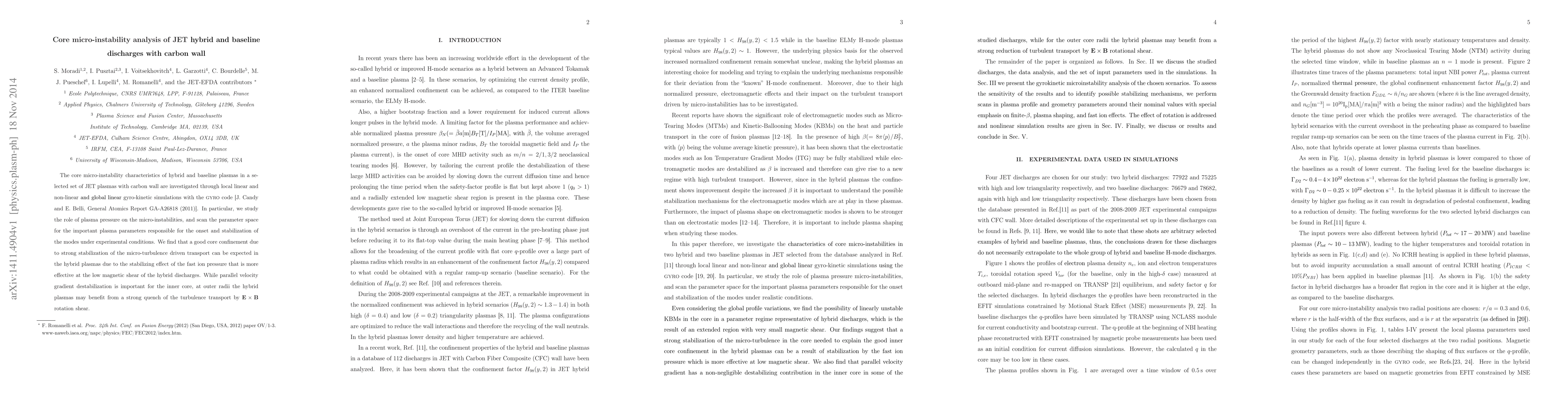The core micro-instability characteristics of hybrid and baseline plasmas in a selected set of JET plasmas with carbon wall are investigated through local linear and non-linear and global linear gyro-kinetic simulations with the GYRO code [J. Candy and E. Belli, General Atomics Report GA-A26818 (2011)]. In particular, we study the role of plasma pressure on the micro-instabilities, and scan the parameter space for the important plasma parameters responsible for the onset and stabilization of the modes under experimental conditions. We find that a good core confinement due to strong stabilization of the micro-turbulence driven transport can be expected in the hybrid plasmas due to the stabilizing effect of the fast ion pressure that is more effective at the low magnetic shear of the hybrid discharges. While parallel velocity gradient destabilization is important for the inner core, at outer radii the hybrid plasmas may benefit from a strong quench of the turbulence transport by $\mathbf{E}\times\mathbf{B}$ rotation shear.
