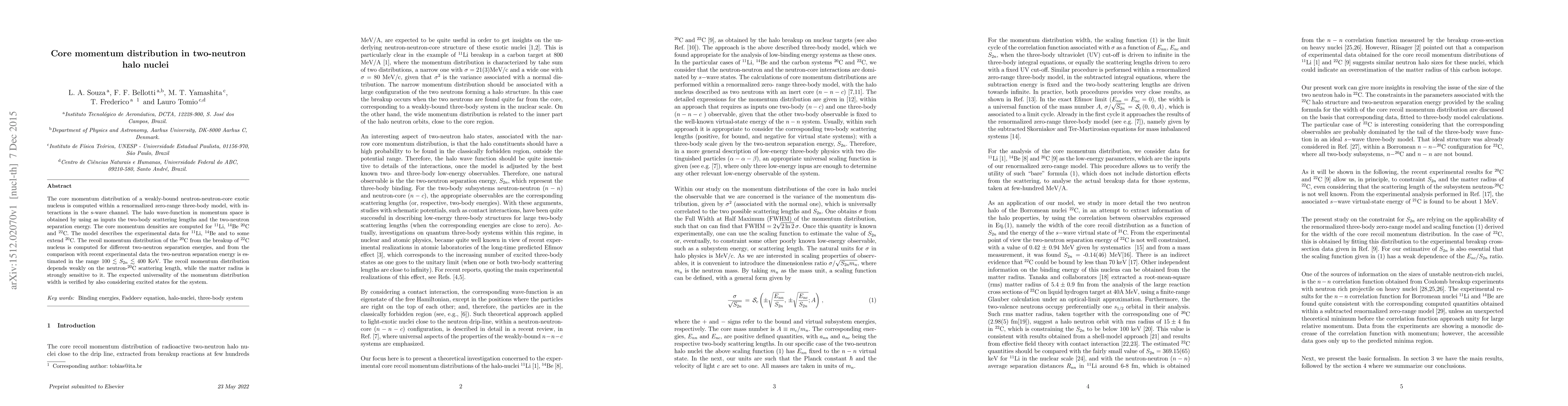 This paper computes the core momentum distribution in neutron-halo nuclei using a zero-range three-body model, finding good agreement with experimental data for $^{11}$Li, $^{14}$Be, and partially for $^{20}$C. The study estimates the two-neutron separation energy for $^{22}$C to be in the range $100\lesssim S_{2n}\lesssim 400$ keV.