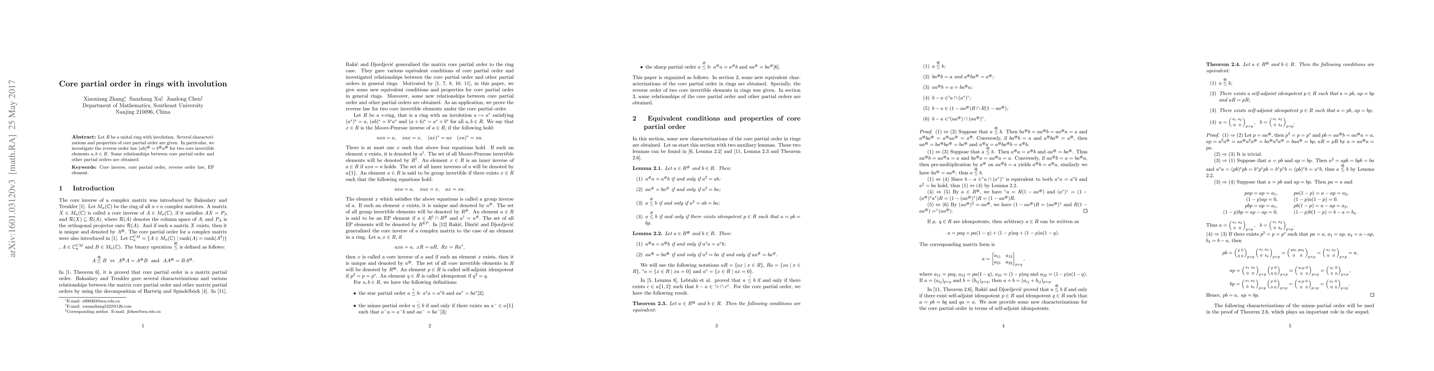 Let $R$ be a unital ring with involution. We give several characterizations and properties of core partial order in $R$. In particular, we investigate the reverse order law $(ab)^{\tiny\textcircled{\tiny\#}} = b^{\tiny\textcircled{\tiny\#}} a^{\tiny\textcircled{\tiny\#}}$ for two core invertible elements $a,b\in R$. Some relationships between core partial order and other partial orders are obtained.