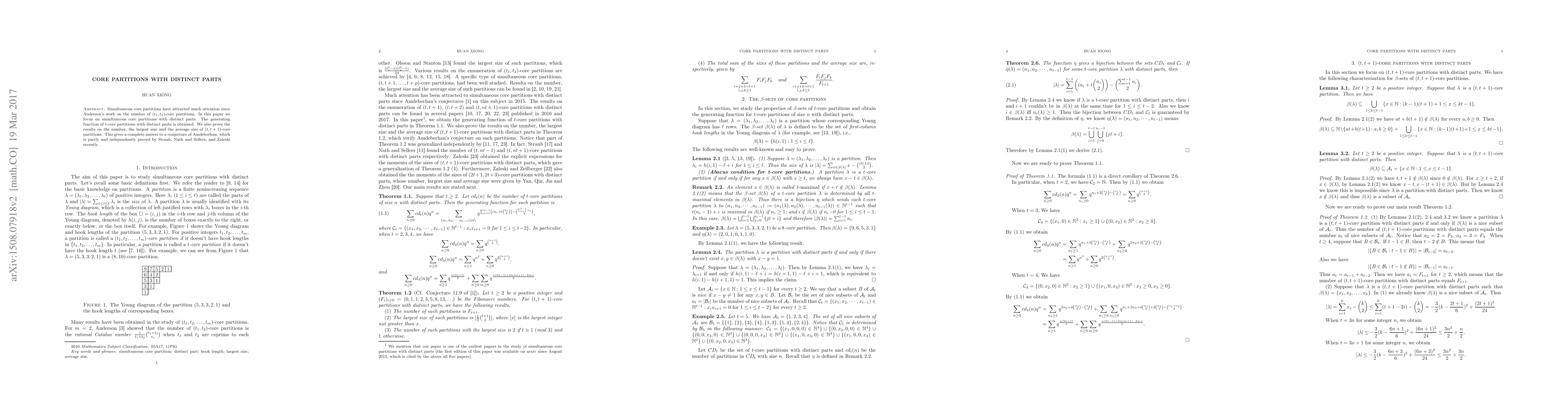 This paper investigates simultaneous core partitions with distinct parts, deriving the generating function for $t$-core partitions with distinct parts and proving results on their number, largest size, and average size. It also resolves a conjecture by Amdeberhan, corroborated by independent work from Straub, Nath, Sellers, and Zaleski.