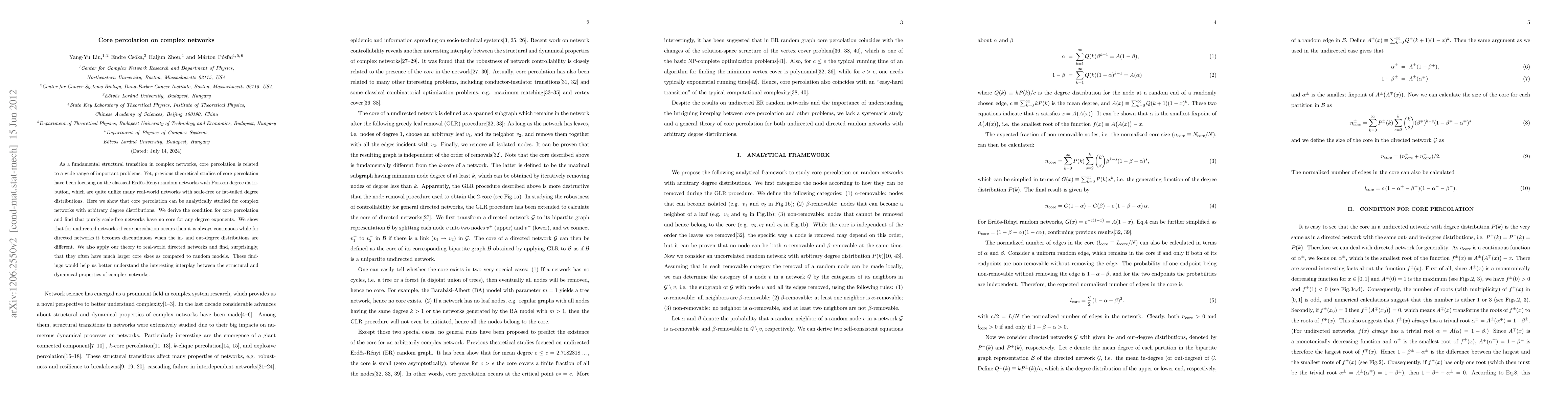 This paper studies core percolation in complex networks with arbitrary degree distributions, finding that scale-free networks lack cores. It reveals that core percolation in undirected networks is continuous, while in directed networks it becomes discontinuous when in- and out-degree distributions differ, and surprisingly, real-world directed networks often have larger core sizes than random models.