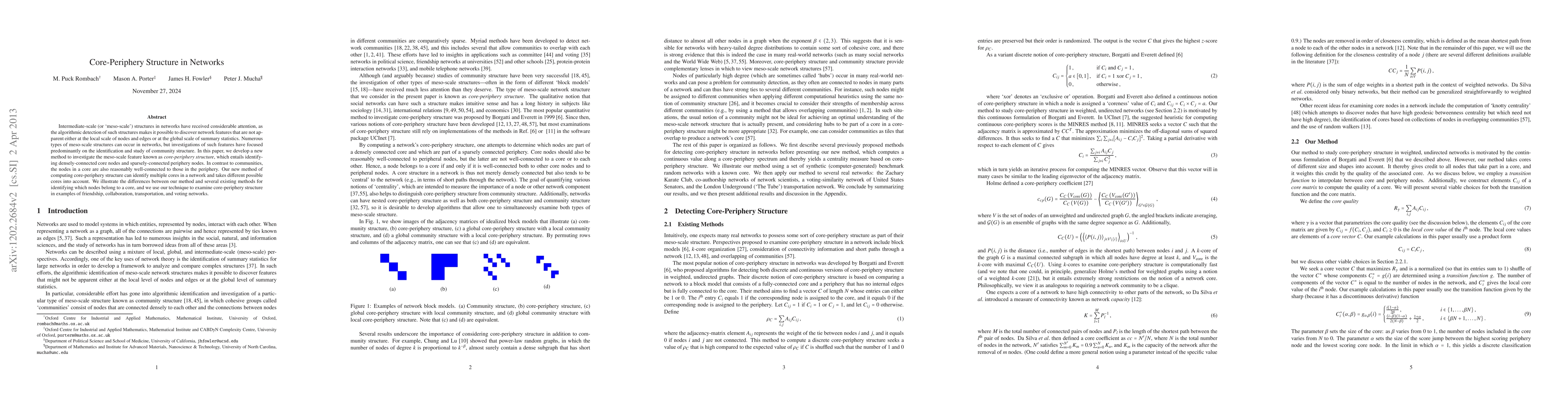 This paper introduces a new method for detecting core-periphery structures in networks, distinguishing densely-connected core nodes from sparsely-connected periphery nodes, and identifies multiple cores. It contrasts this approach with existing methods and applies it to various network types to illustrate its effectiveness.
