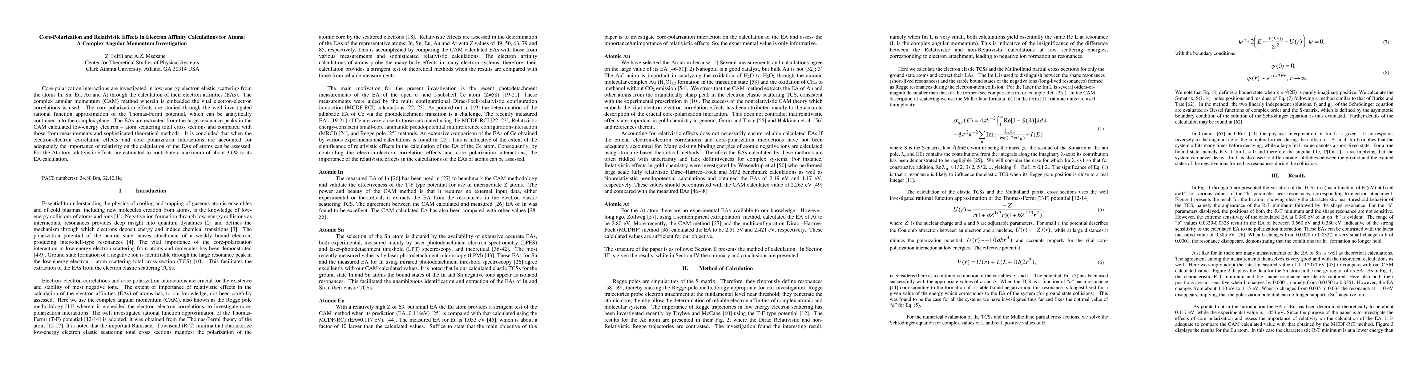 Core-polarization interactions are investigated in low-energy electron elastic scattering from the atoms In,Sn,Eu,Au and At through the calculation of their electron affinities. The complex angular momentum method wherein is embedded the vital electron-electron correlations is used. The core-polarization effects are studied through the well investigated rational function approximation of the Thomas-Fermi potential,which can be analytically continued into the complex plane. The EAs are extracted from the large resonance peaks in the calculated low-energy electron atom scattering total cross sections and compared with those from measurements and sophisticated theoretical methods. It is concluded that when the electron-electron correlation effects and core polarization interactions are accounted for adequately the importance of relativity on the calculation of the electron affinities of atoms can be assessed. For At, relativistic effects are estimated to contribute a maximum of about 3.6 percent to its (non-relativistic) calculated electron affinity.