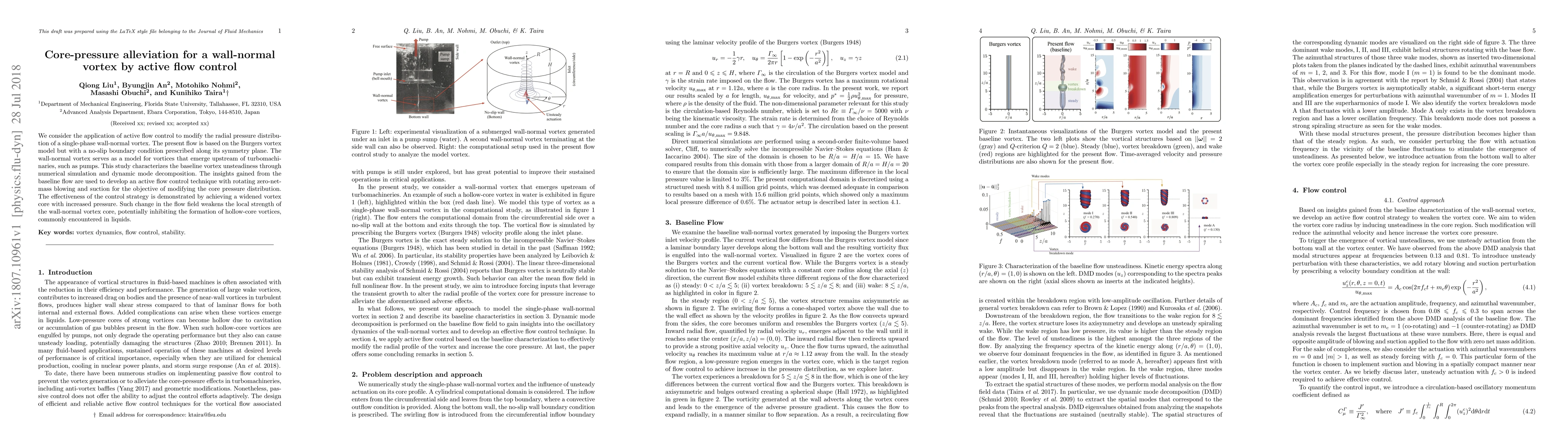 We consider the application of active flow control to modify the radial pressure distribution of a single-phase wall-normal vortex. The present flow is based on the Burgers vortex model but with a no-slip boundary condition prescribed along its symmetry plane. The wall-normal vortex serves as a model for vortices that emerge upstream of turbomachinaries, such as pumps. This study characterizes the baseline vortex unsteadiness through numerical simulation and dynamic mode decomposition. The insights gained from the baseline flow are used to develop an active flow control technique with rotating zero-net-mass blowing and suction for the objective of modifying the core pressure distribution. The effectiveness of the control strategy is demonstrated by achieving a widened vortex core with increased pressure. Such change in the flow field weakens the local strength of the wall-normal vortex core, potentially inhibiting the formation of hollow-core vortices, commonly encountered in liquids.