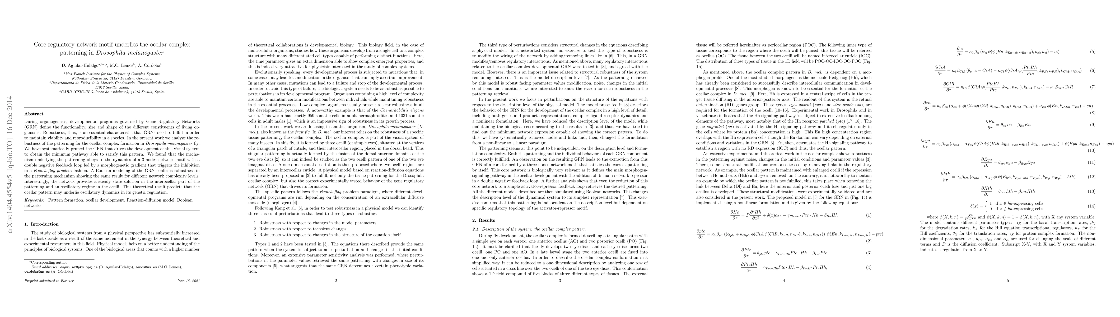 During organogenesis, developmental programs governed by Gene Regulatory Networks (GRN) define the functionality, size and shape of the different constituents of living organisms. Robustness, thus, is an essential characteristic that GRNs need to fulfill in order to maintain viability and reproducibility in a species. In the present work we analyze the robustness of the patterning for the ocellar complex formation in Drosophila melanogaster fly. We have systematically pruned the GRN that drives the development of this visual system to obtain the minimum pathway able to satisfy this pattern. We found that the mechanism underlying the patterning obeys to the dynamics of a 3-nodes network motif with a double negative feedback loop fed by a morphogenetic gradient that triggers the inhibition in a French flag problem fashion. A Boolean modeling of the GRN confirms robustness in the patterning mechanism showing the same result for different network complexity levels. Interestingly, the network provides a steady state solution in the interocellar part of the patterning and an oscillatory regime in the ocelli. This theoretical result predicts that the ocellar pattern may underlie oscillatory dynamics in its genetic regulation.