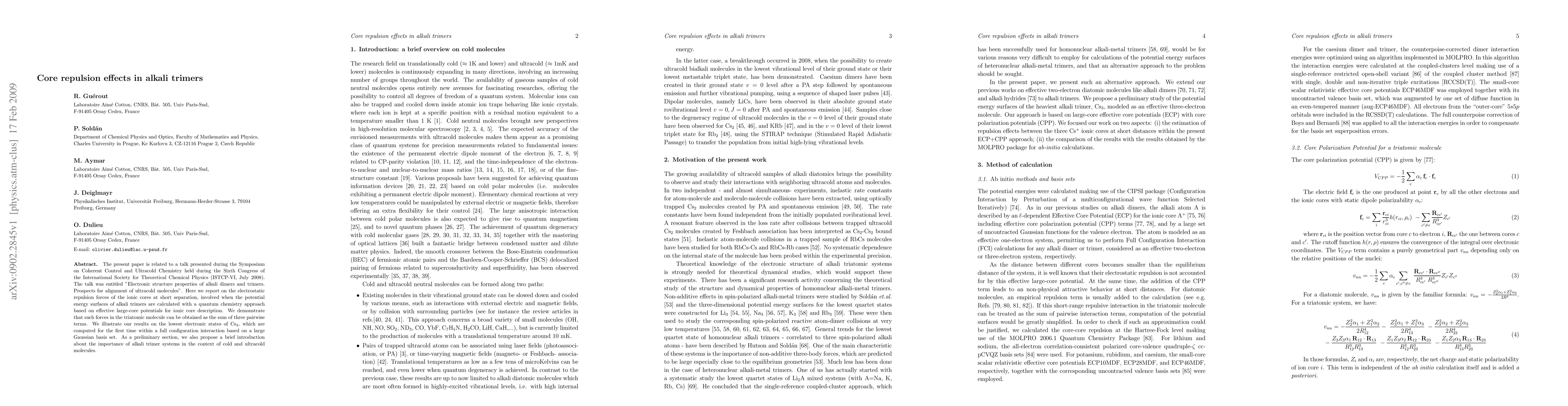 The present paper is related to a talk presented during the Symposium on Coherent Control and Ultracold Chemistry held during the Sixth Congress of the International Society for Theoretical Chemical Physics (ISTCP-VI, July 2008). The talk was entitled "Electronic structure properties of alkali dimers and trimers. Prospects for alignment of ultracold molecules". Here we report on the electrostatic repulsion forces of the ionic cores at short separation, involved when the potential energy surfaces of alkali trimers are calculated with a quantum chemistry approach based on effective large-core potentials for ionic core description. We demonstrate that such forces in the triatomic molecule can be obtained as the sum of three pairwise terms. We illustrate our results on the lowest electronic states of Cs$_3$, which are computed for the first time within a full configuration interaction based on a large Gaussian basis set. As a preliminary section, we also propose a brief introduction about the importance of alkali trimer systems in the context of cold and ultracold molecules.