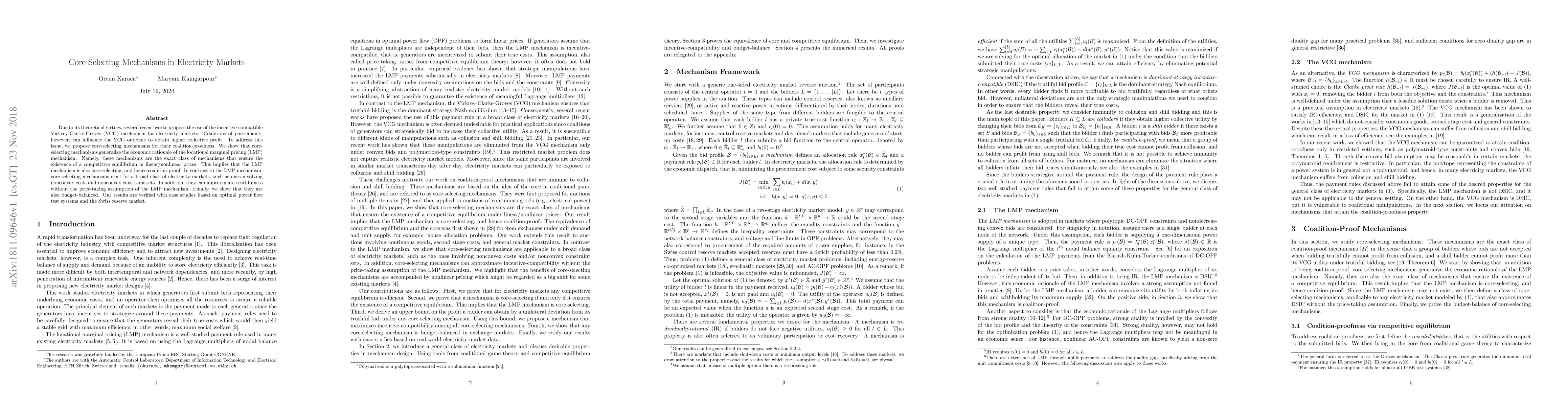 Due to its theoretical virtues, several recent works propose the use of the incentive-compatible Vickrey-Clarke-Groves (VCG) mechanism for electricity markets. Coalitions of participants, however, can influence the VCG outcome to obtain higher collective profit. To address this issue, we propose core-selecting mechanisms for their coalition-proofness. We show that core-selecting mechanisms generalize the economic rationale of the locational marginal pricing (LMP) mechanism. Namely, these mechanisms are the exact class of mechanisms that ensure the existence of a competitive equilibrium in linear/nonlinear prices. This implies that the LMP mechanism is also core-selecting, and hence coalition-proof. In contrast to the LMP mechanism, core-selecting mechanisms exist for a broad class of electricity markets, such as ones involving nonconvex costs and nonconvex constraint sets. In addition, they can approximate truthfulness without the price-taking assumption of the LMP mechanism. Finally, we show that they are also budget-balanced. Our results are verified with case studies based on optimal power flow test systems and the Swiss reserve market.